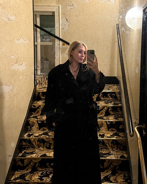 The Frankie Shop Nicola coat - sold out - similar here; Skall Studio shirt; The Frakie shop leather skirt; Dehanche Undone corset worn as a belt; Khaite Nevada boots; Agmes studio necklace.