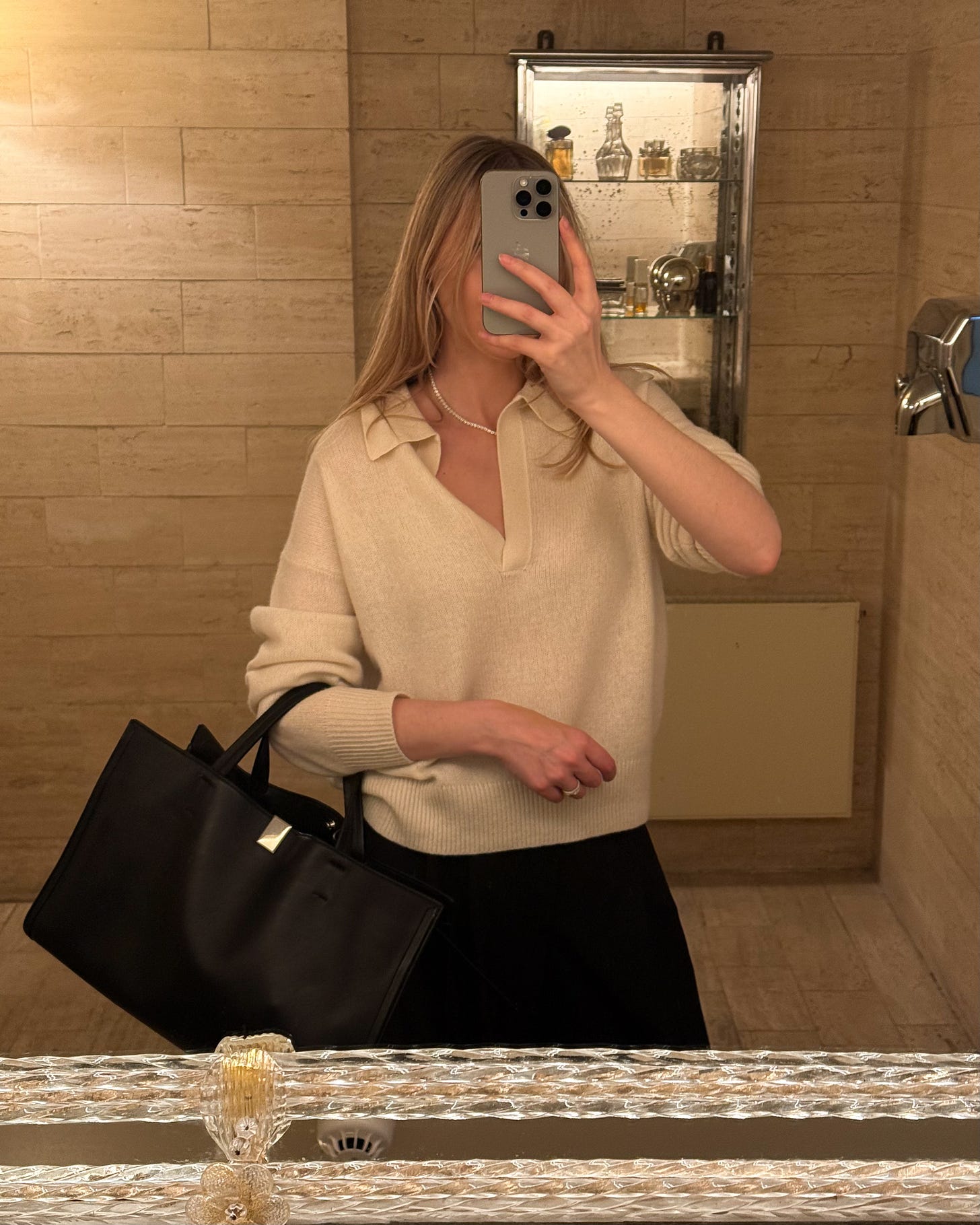 Almada Label Sweater; Ani Jewels Necklace; Phoebe Philo bag; Hermes loafers; Lisa Yang Cashmere socks.