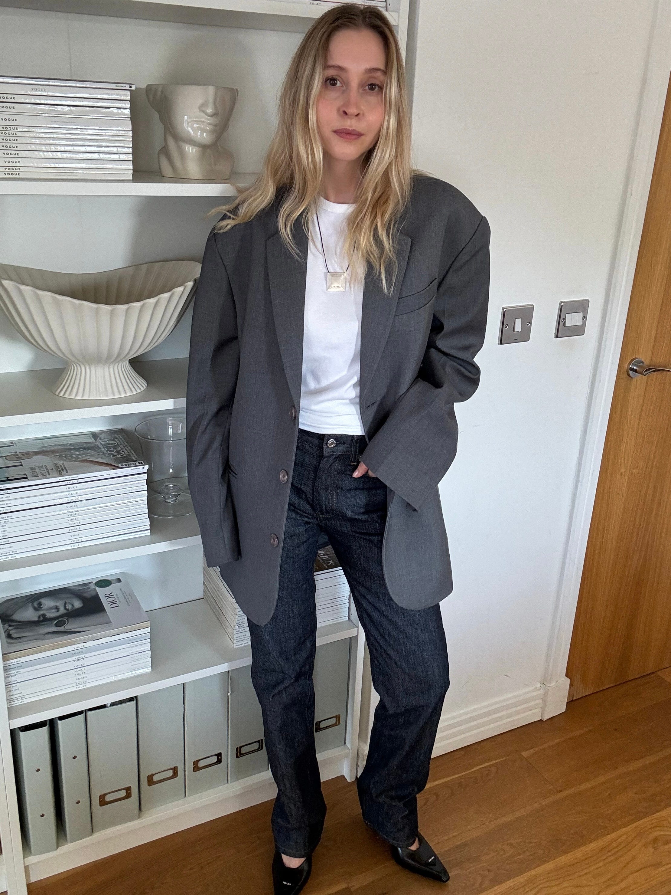 Finally, this is what I call my Friday Office look, pair of jeans and grey blazer, business casual so to say. But I’ve dressed it up with my Prada heels (old, similar here) and necklace from Ani, also wearing The Frankie Shop blazer and same Teym long sleeve t-shirt.
