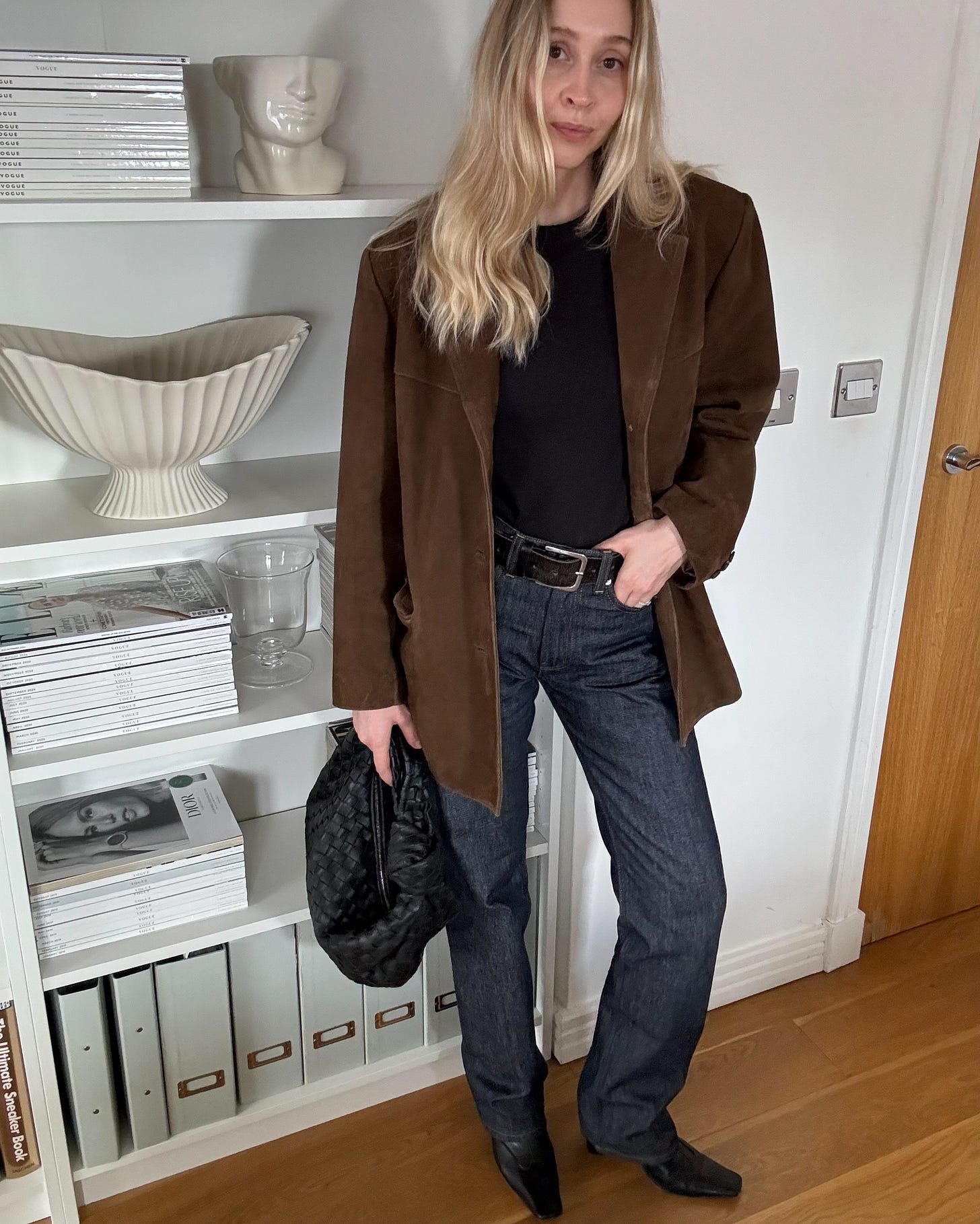 Brown suede jacket and dark blue denim, do I even need to say more? I’m pairing it with black basic tee I’ve purchased from Uniqlo, Khaite boots, zara belt (not available anymore) and Bottega Jodi.