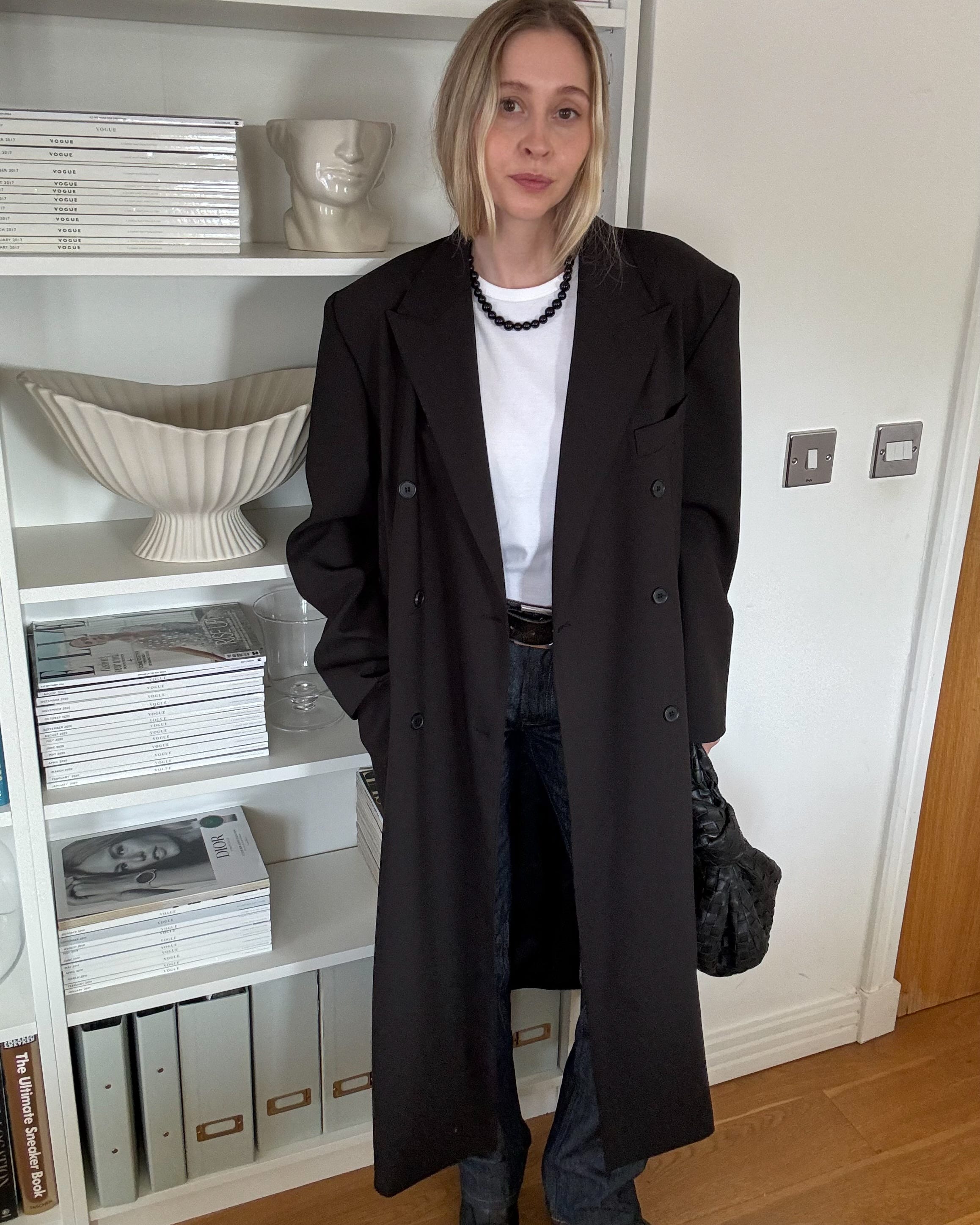 This light blazer type coat has been breaking my dms on instagram since the day I started wearing it, and it is one of the pieces that will always be there for you. So no surprise I’ve reached out for it to pair with my new pair of jeans. It is very classic look that doesn’t require much effort, but always looks like you’ve made an effort. I’m wearing The Frankie shop coat, Teym long sleeve t-shirt (I think Teym is one of the best places to buy your basics, quality is top notch), Labro bead necklace, same Khaite boots and same bag.
