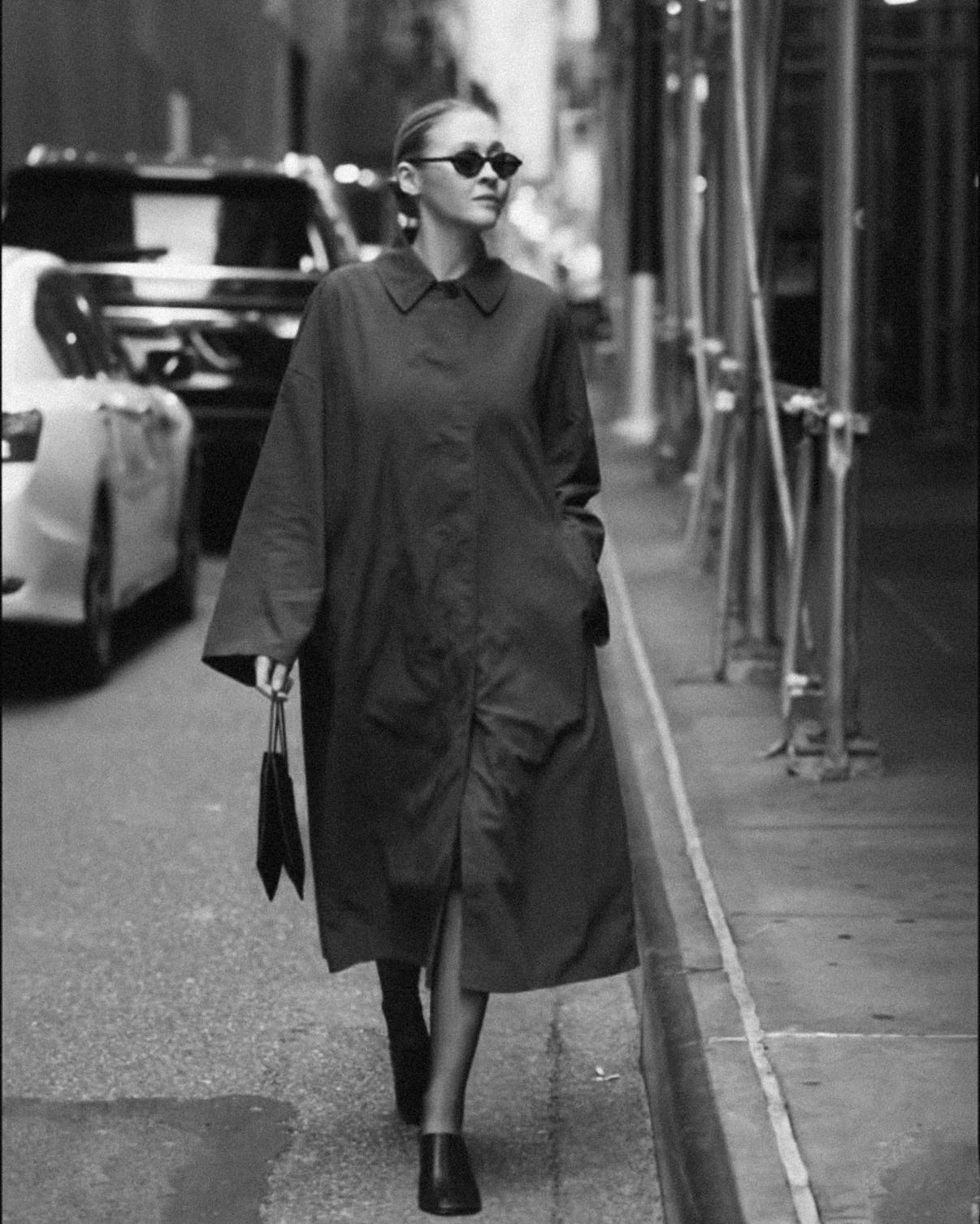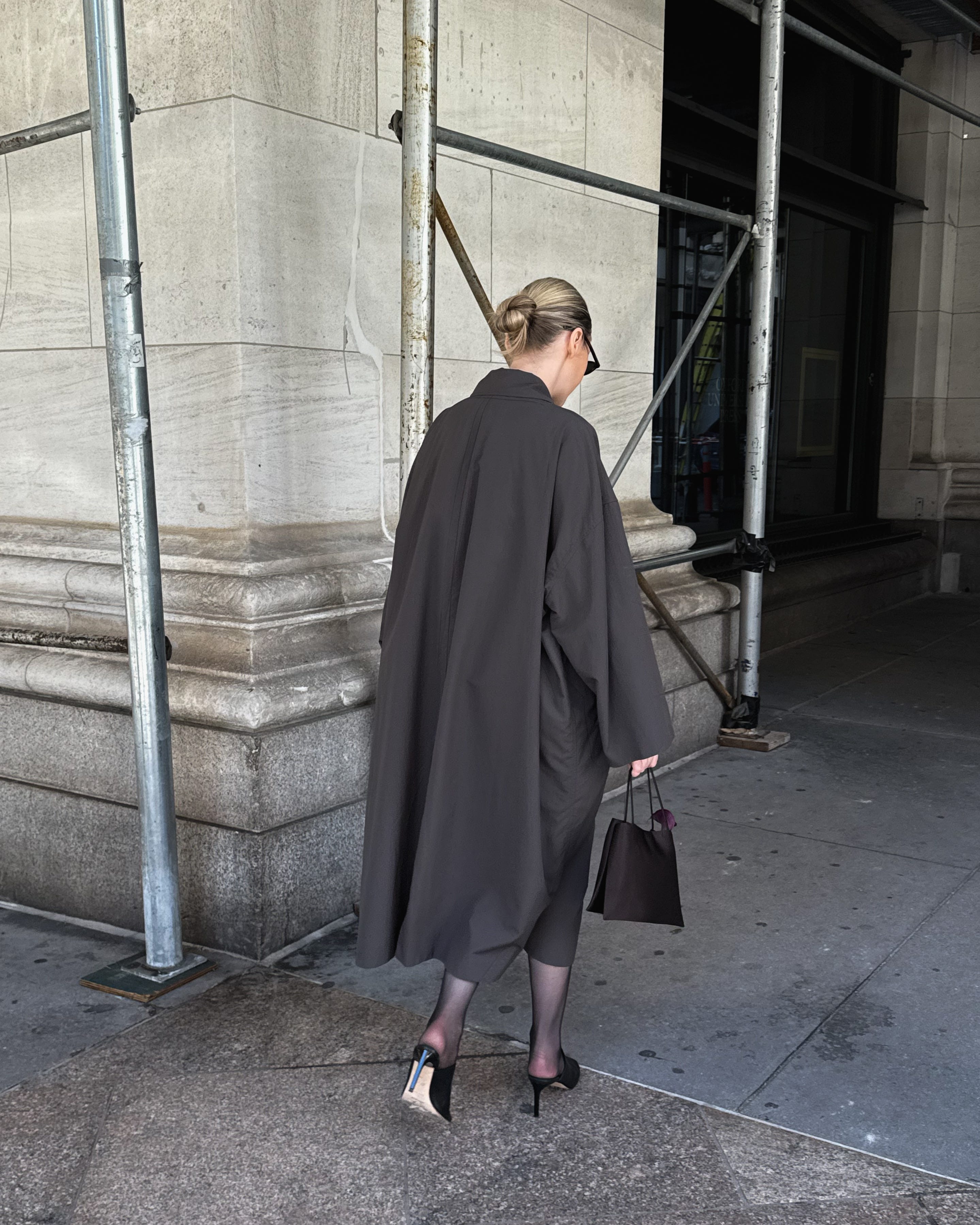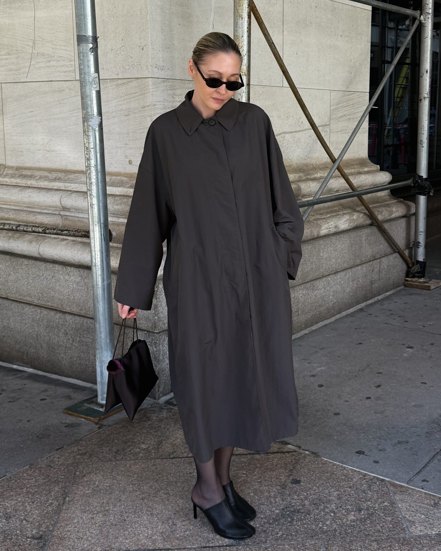 The Row Arwen coat (sold out everywhere, found one in different colour here; I’m wearing size S), covering Toteme skirt I got on sale (if I’d be shopping now, I’d go for this one) and light cotton Leset Margo t-shirt; Dear Frances Sadie mules (half sizes take size up, I’m 39.5 wearing 40); The Row silk bag; Saint Laurent sunglasses.