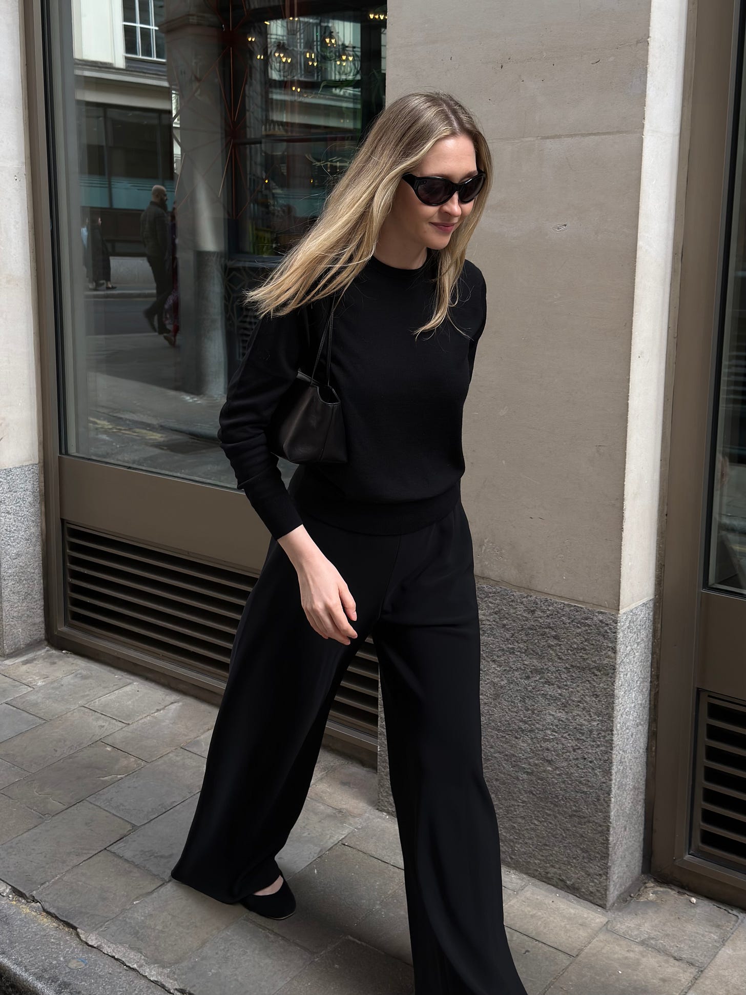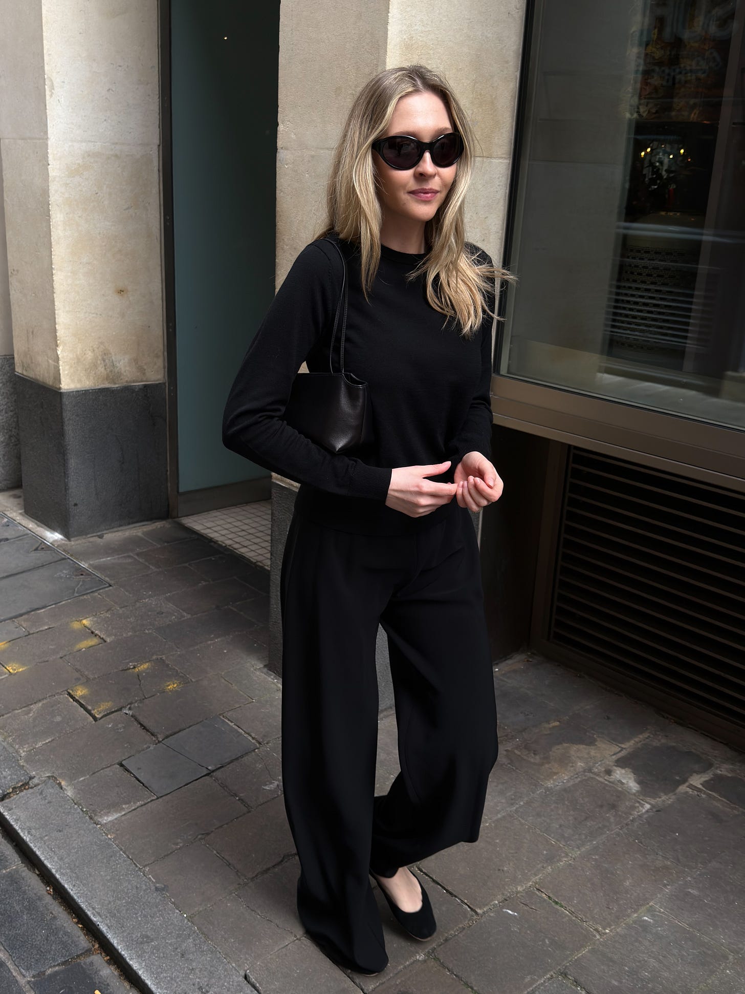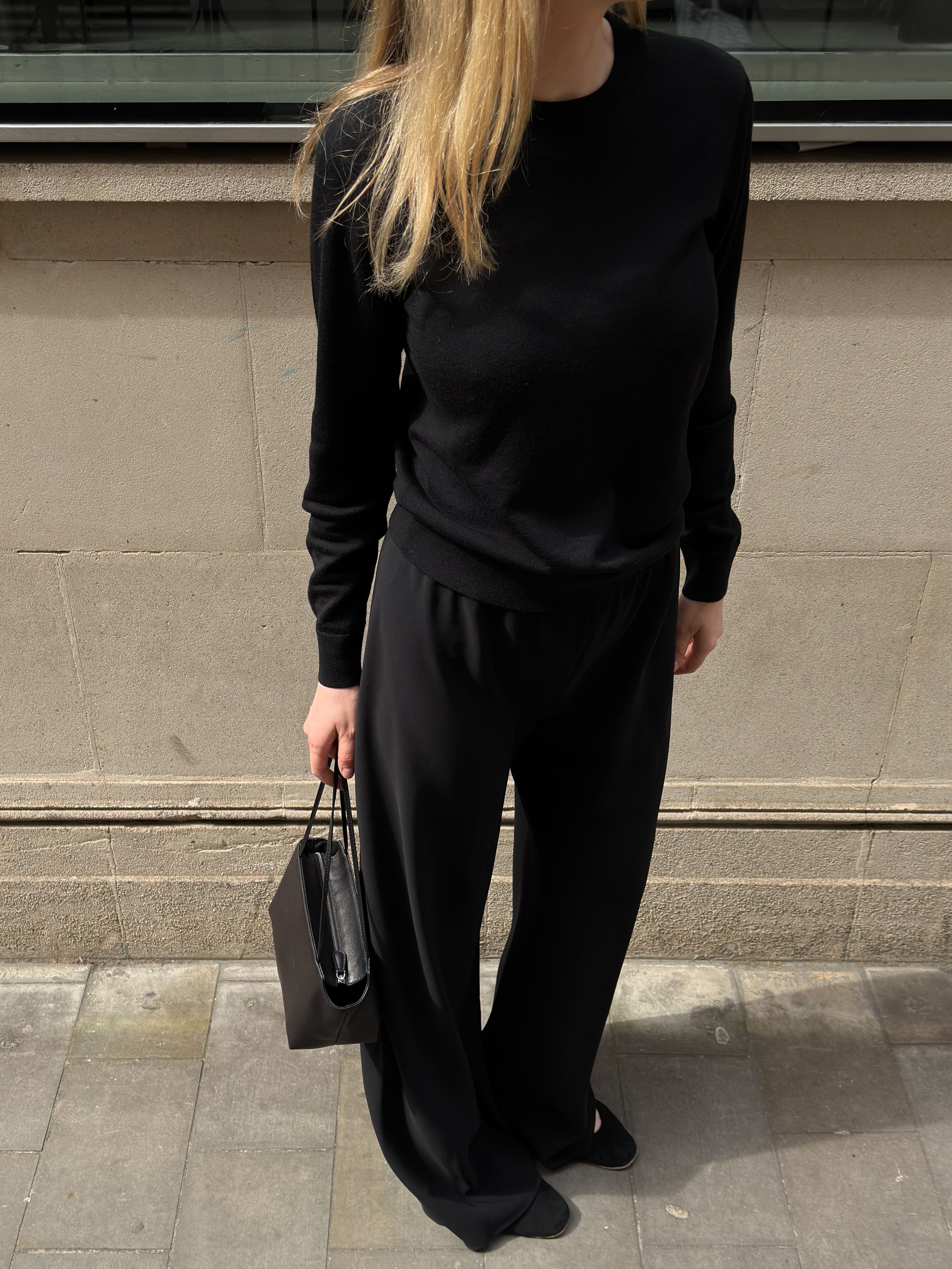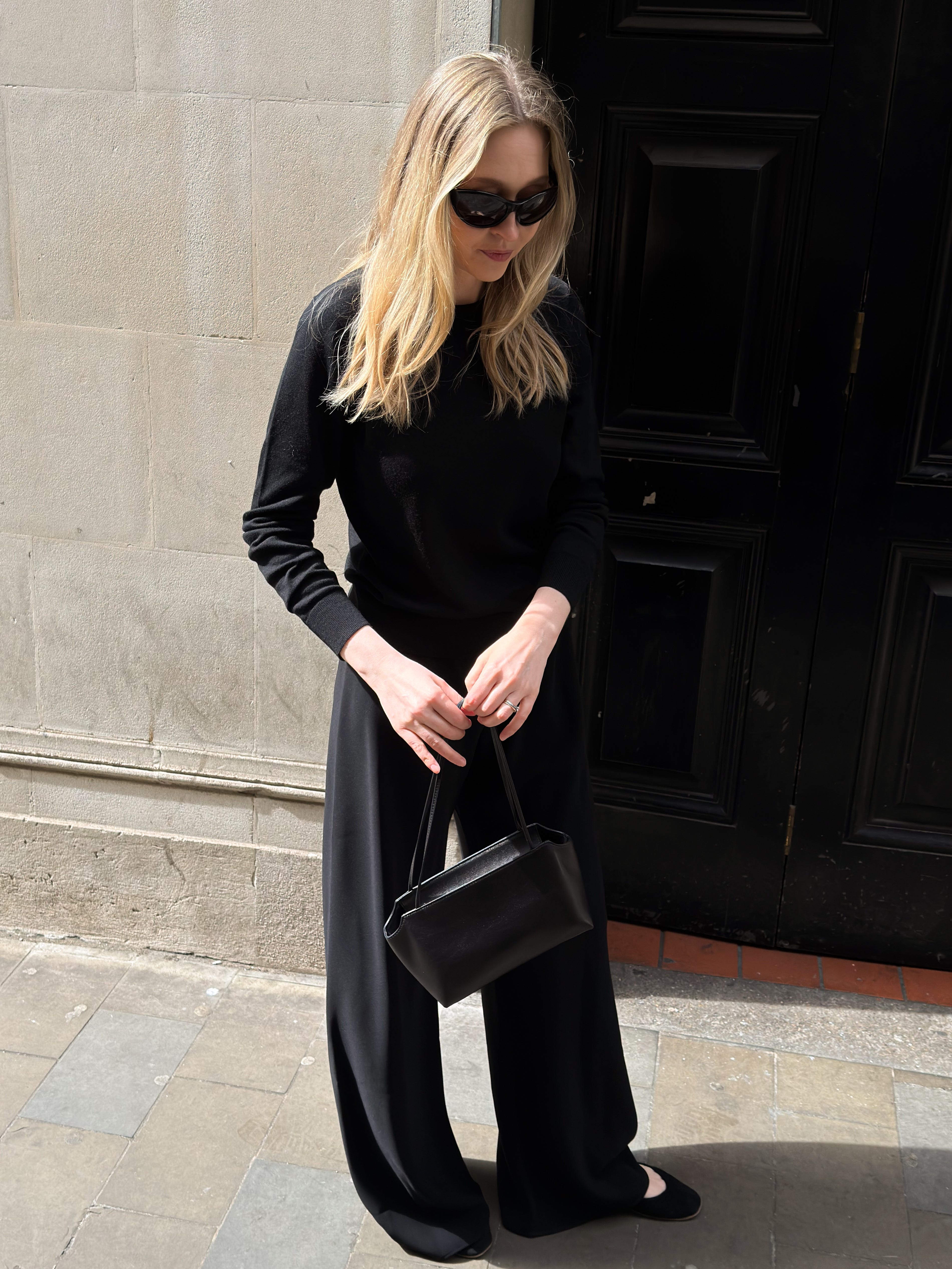 The Row Gala pants, Gemma flats and Terrase to-go bag; Uniqlo crewneck; Vincent Boulevard sunglasses.