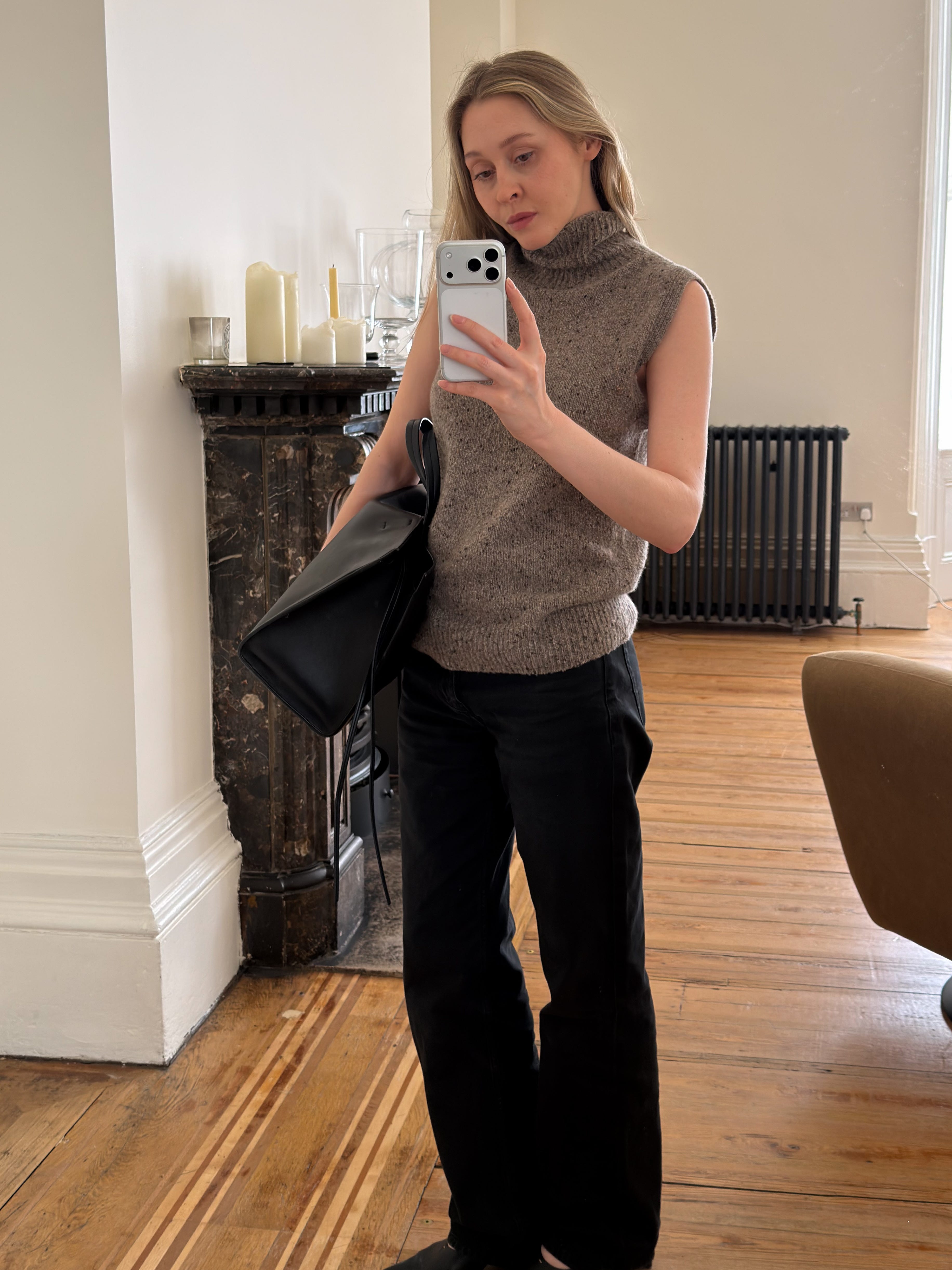The Row turtleneck vest; Phoebe Philo classic jeans; Khaite low pumps; Phoebe Philo cabas bag.