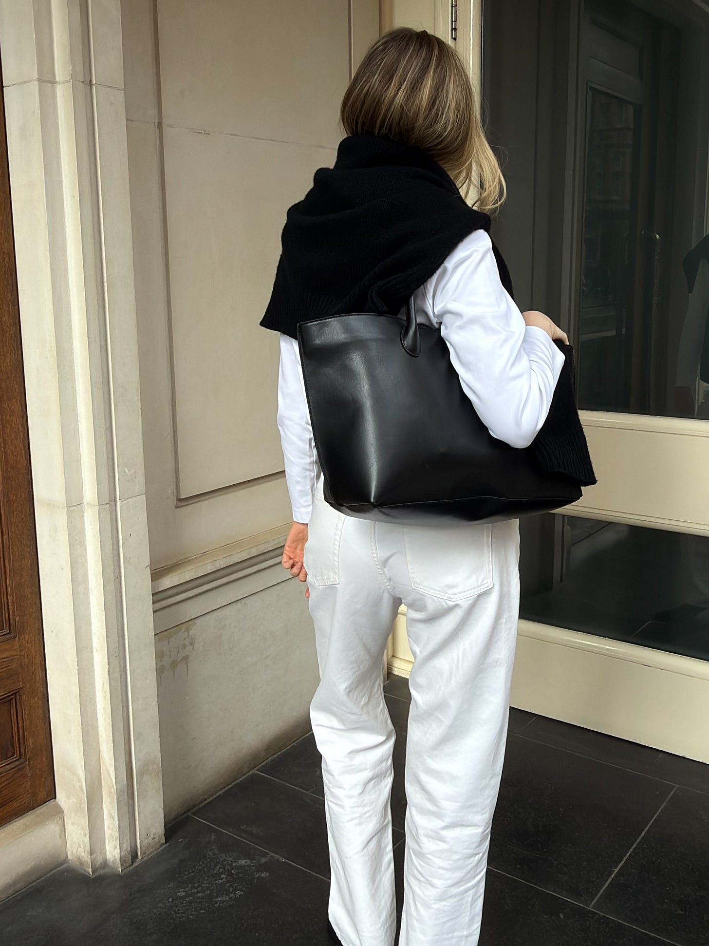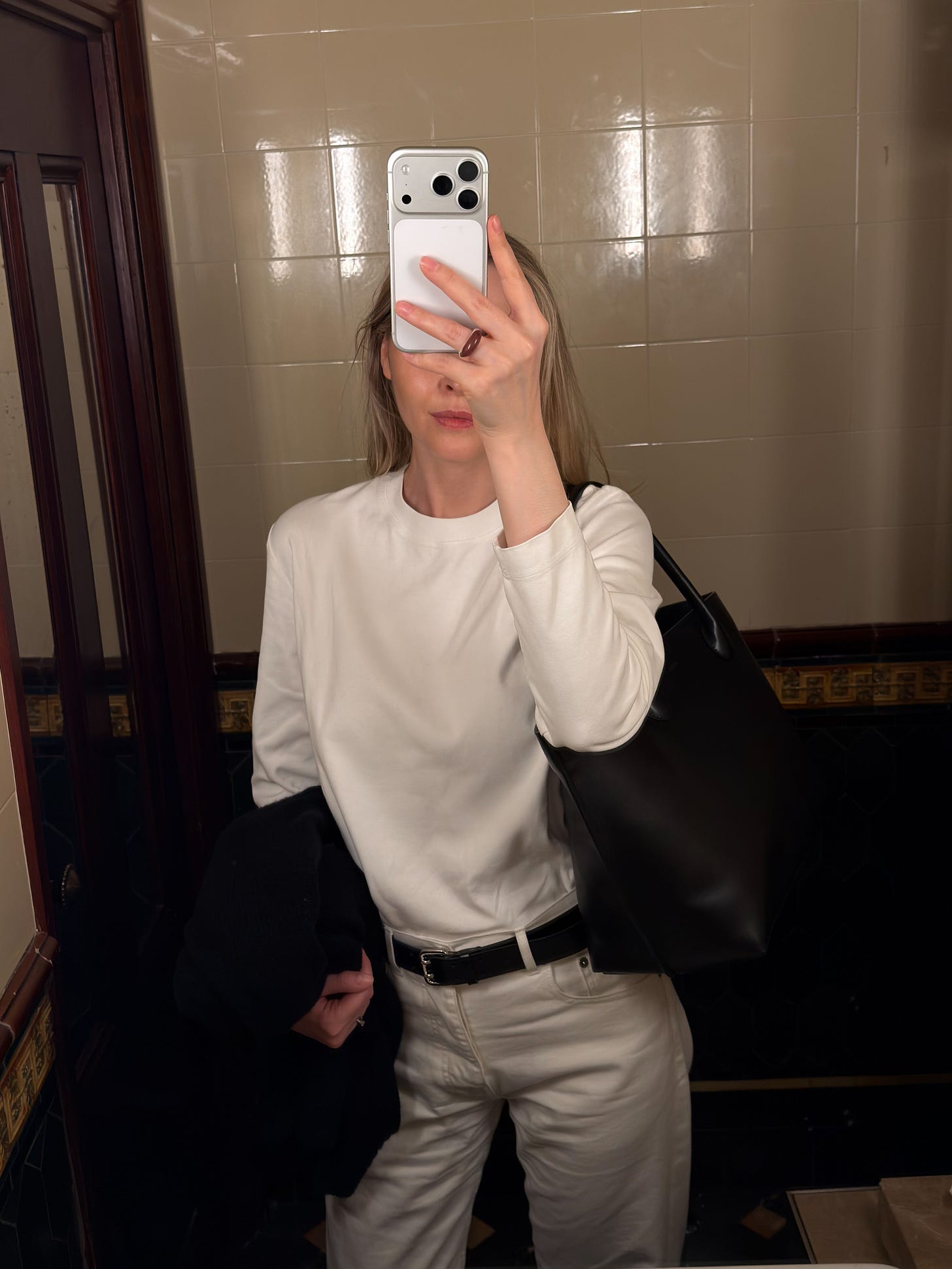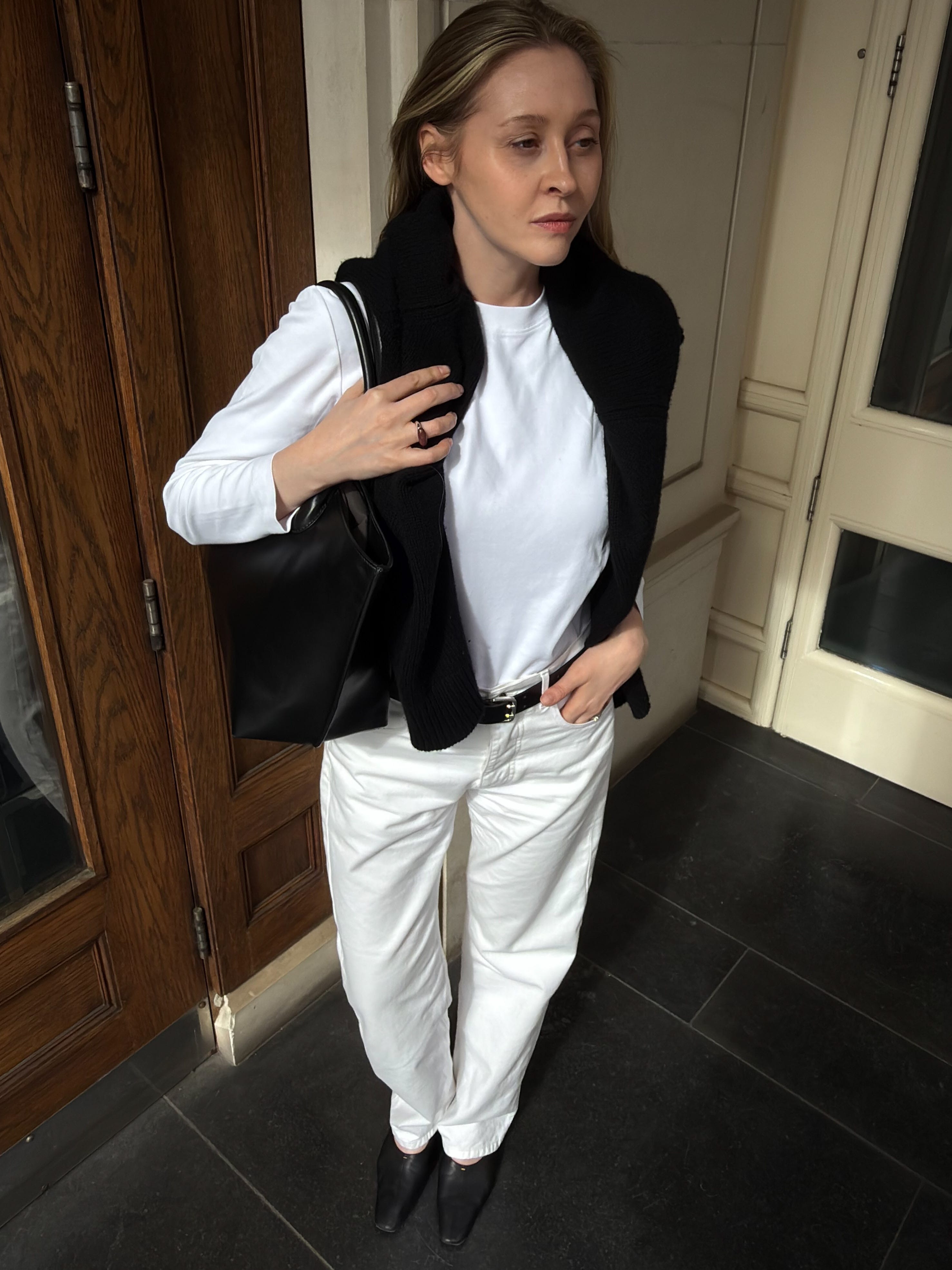 COS long-sleeve t-shirt; Lie Studio Grace tote; Lie Studio Beatrice ring; Dehanche belt; Almada knit; Phoebe Philo classic jeans in plaster white; Khaite low pumps.