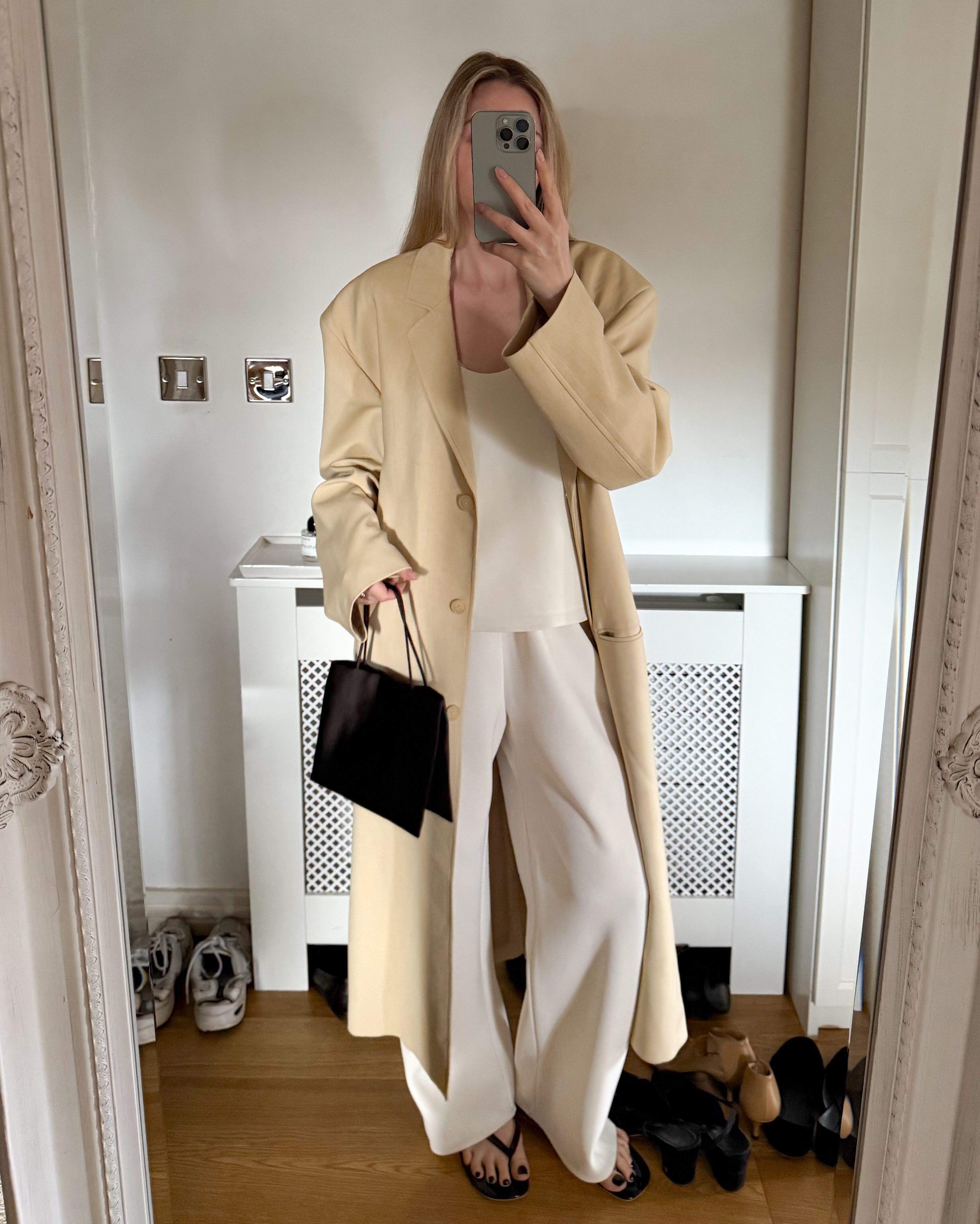 Look 2. Almada crepe trouser and top set; The Frankie shop coat, The Row Cecily bag; Carmen flip flops.