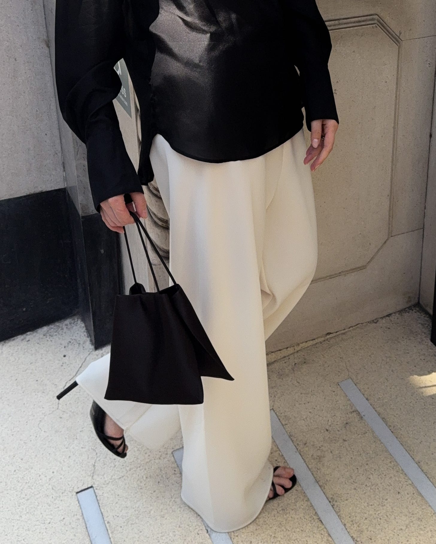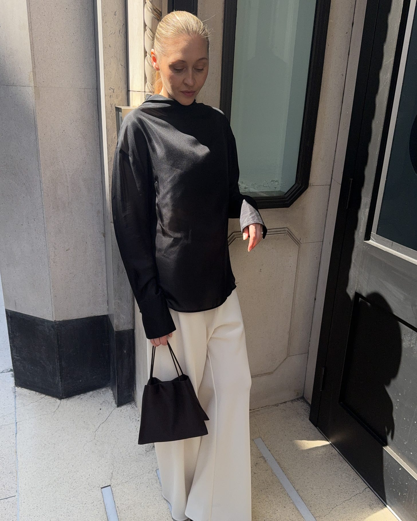 Look 3. Almada crepe trousers; Yaneth silk blouse; The Row Cecily bag; Celine heeled sandals (bought them few seasons back, but would have loved these Jil Sander ones too).