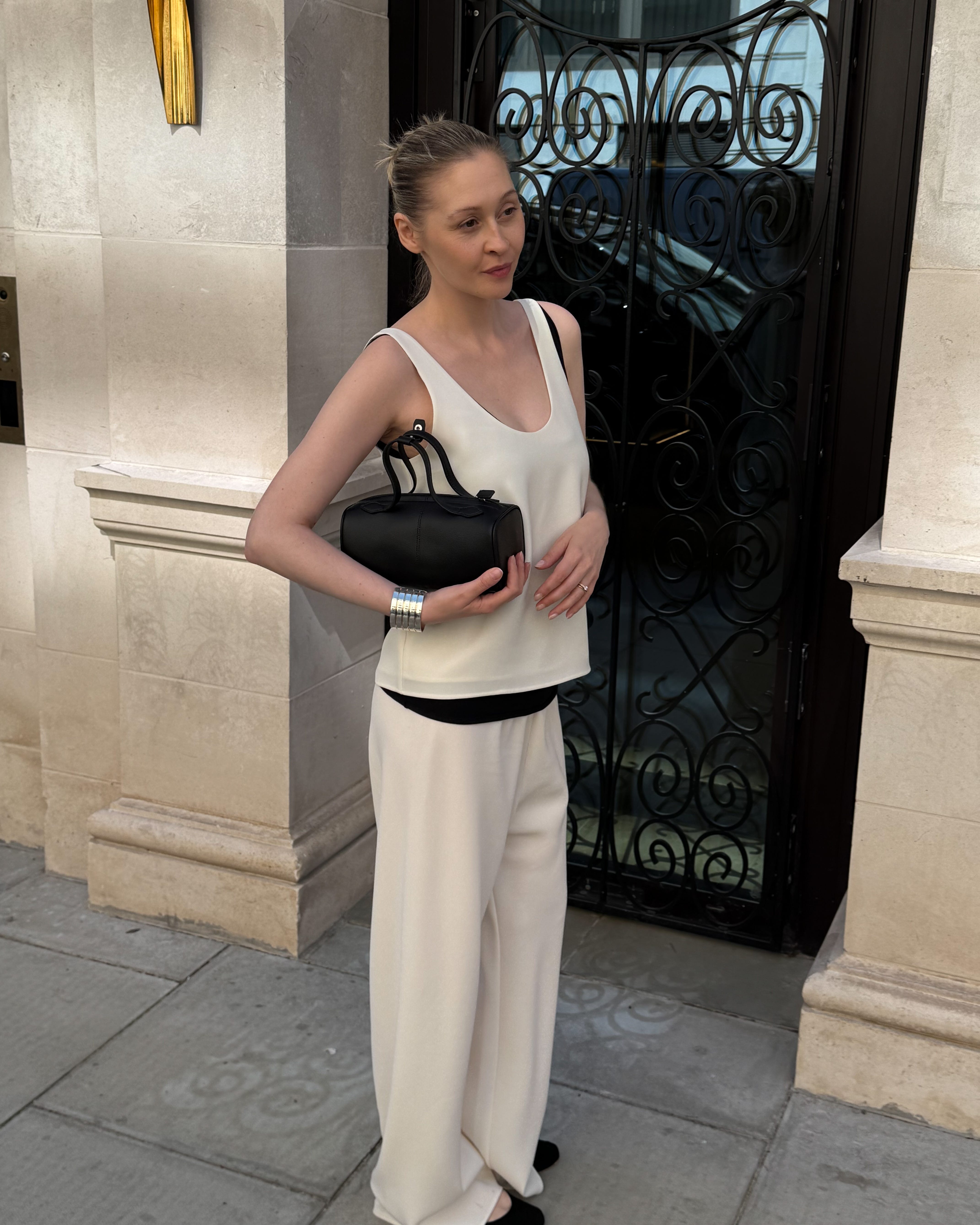 Look 1. Almada crepe trouser and top set; Massimo Dutti strappy top; The Row flats; Freja bag; Ani bracelet.