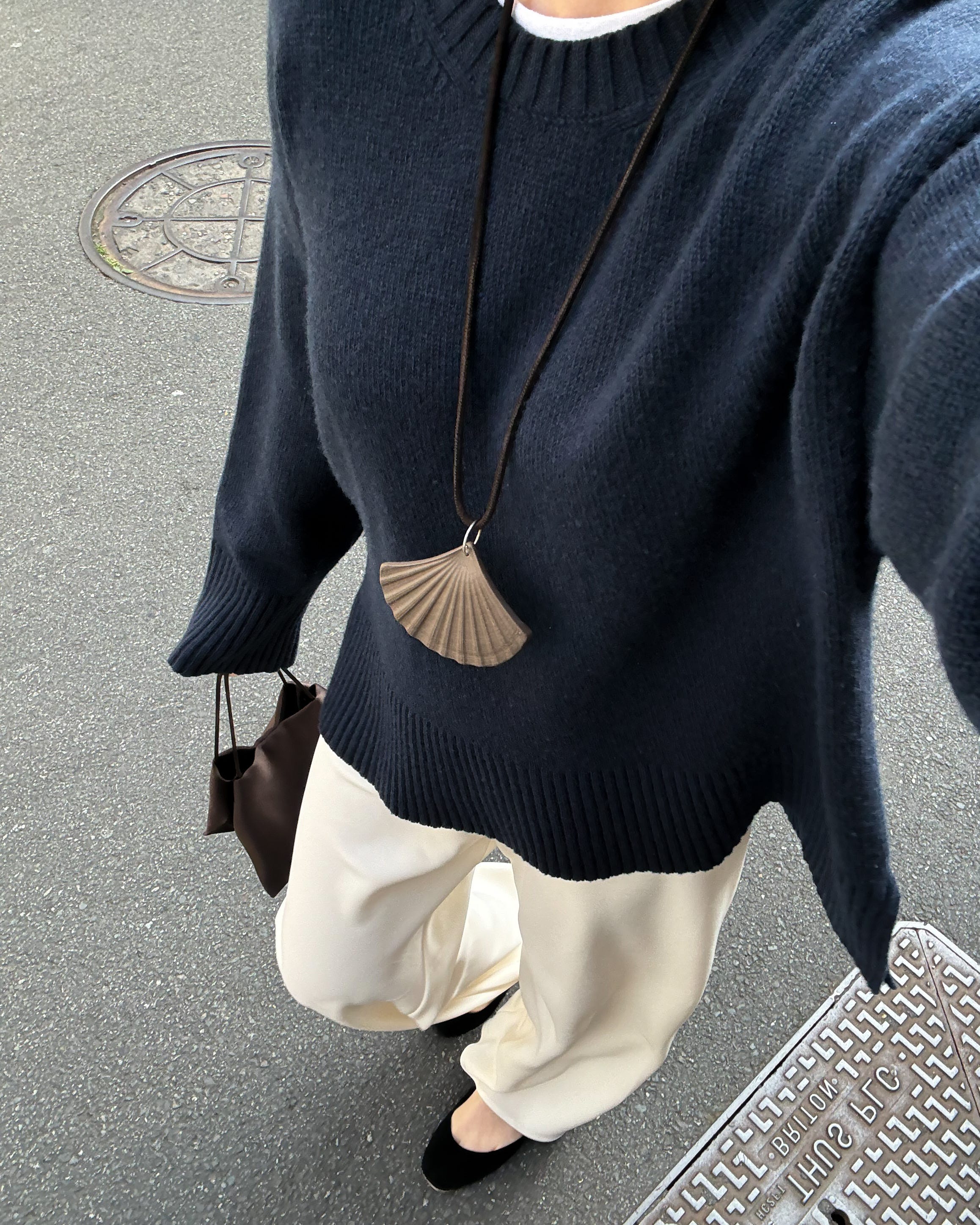 Look 4. Almada crepe trousers; My essential wardrobe knit; Leset t-shirt; The Row Cecily bag; The Row flats; Manà shell necklace.
