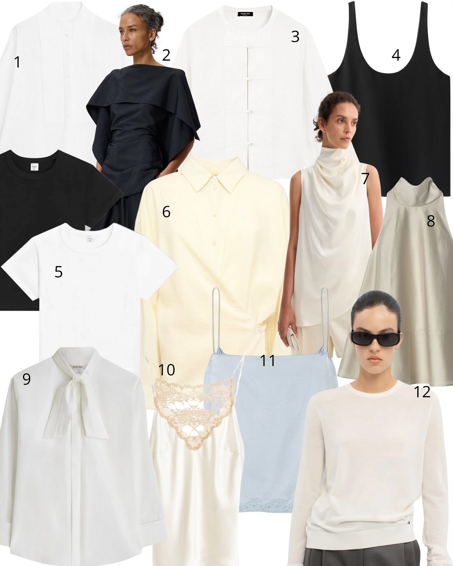 1. Massimo Dutti fine linen shirt; 2. Rohe Oranda No Kazaguruma Top; 3. Massimo Dutti flowing linen shirt; 4. Almada Label Romy crepe top; 5. Leset Margo two pack; 6. Lemaire Dry silk straight collar shirt; 7. Rohe draped satin top; 8. Cos fluid halterneck top; 9. Phoebe Philo the neck shirt; 10. By Malene Borger Leeba top; 11. The Row Kilari Camisole; 12. Aflalo Enar light sweater.