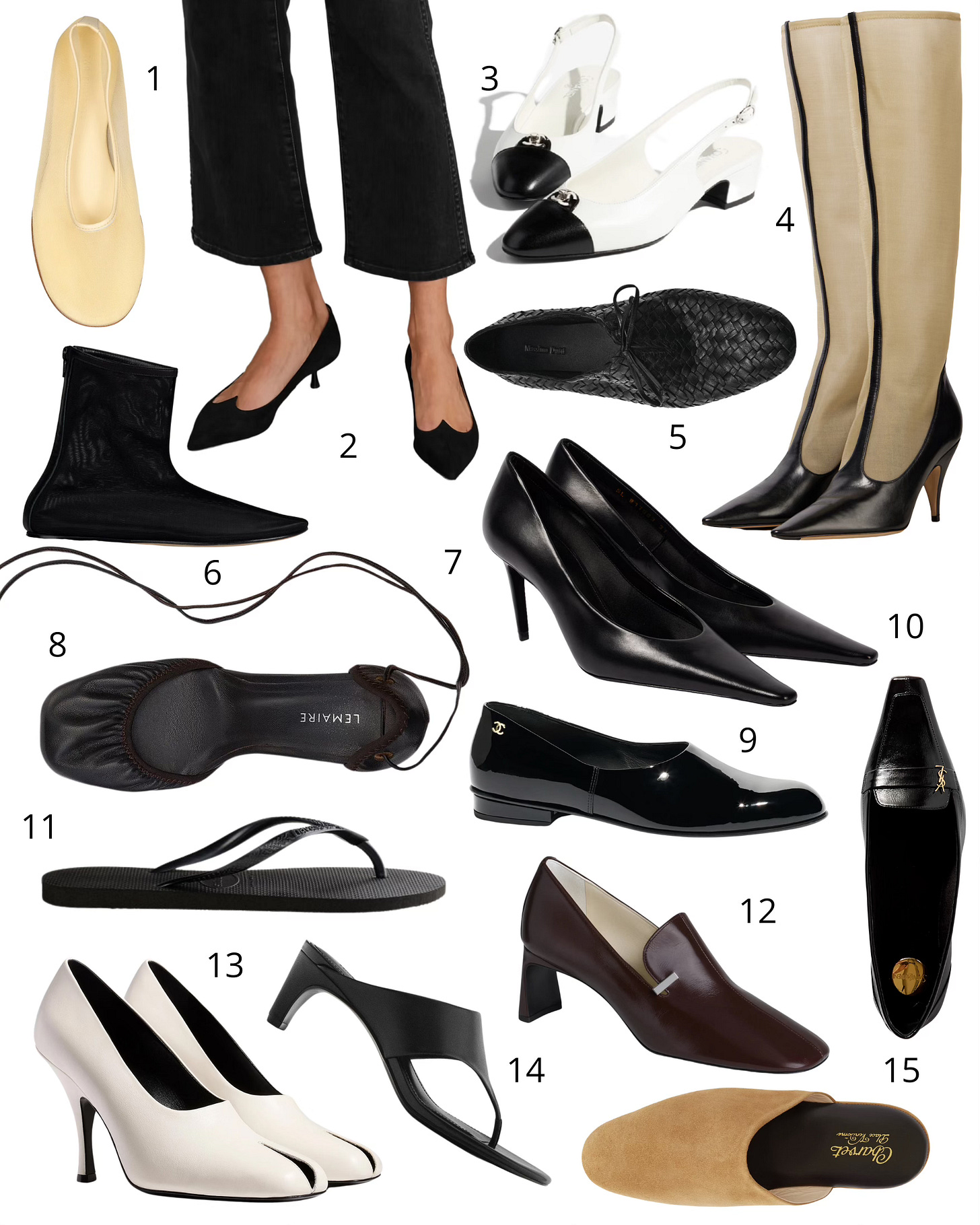 1. Dear Frances, Balla mesh ballet flats; 2. Roger Vivier suede pumps; 3. Chanel Slingbacks; 4. The Row mesh and leather boots; 5. Massimo Dutti braided ballet flats; 6. Dear Frances Balla Bootie in mesh; 7. Saint Laurent Anne-Marie pumps; 8. Lemaire Micro Ballerina ruched leather pumps; 9. Chanel scuba moccasins; 10. Saint Laurent poppy loafers; 11. Havaianas slim; 12. Phoebe Philo club loafer; 13. Khaite Eva peep toe pumps; 14. Massimo Dutti nappa sandals; 15. Charvet suede slippers.