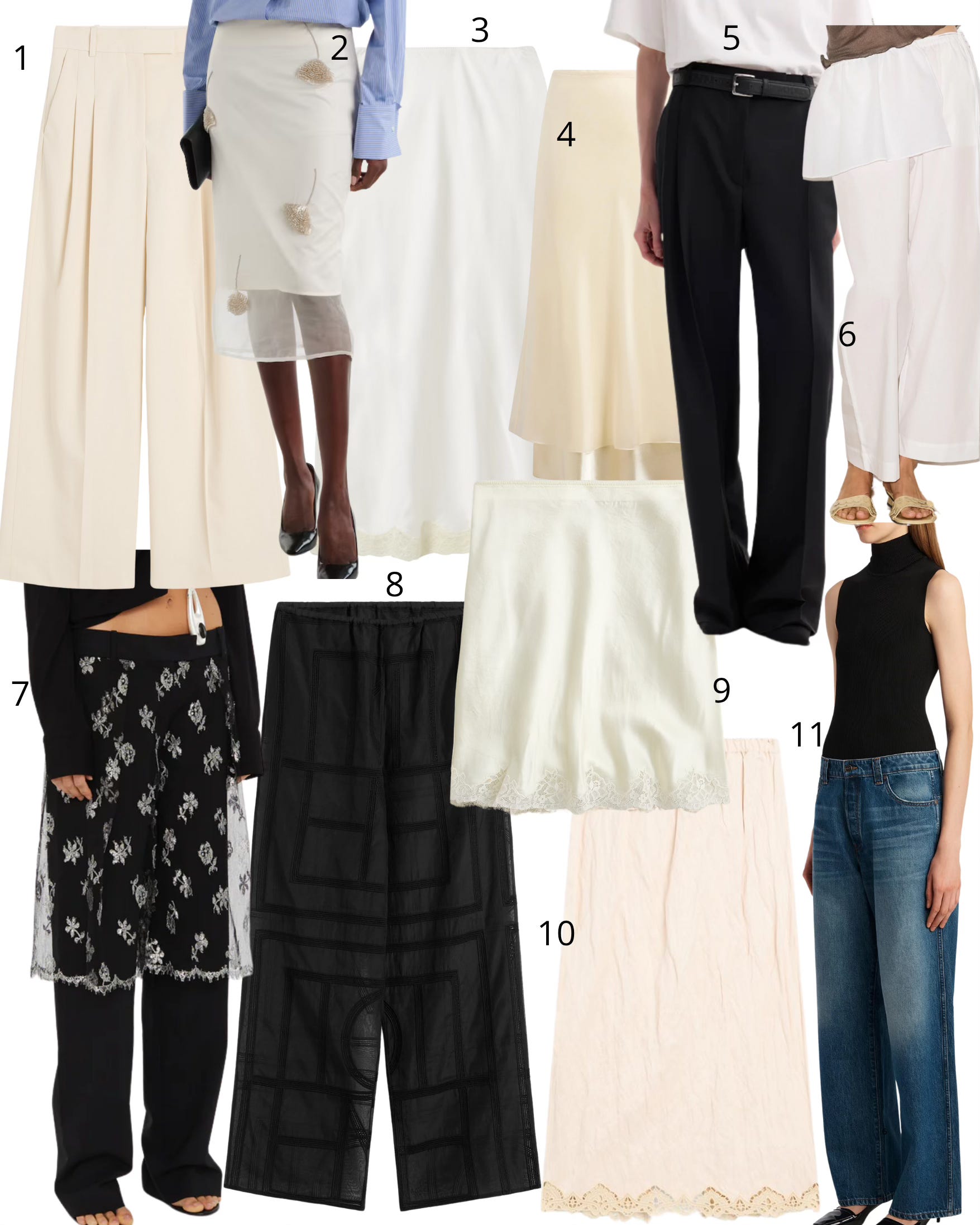 1. By Malene Birger Cymbaria high-waist trousers; 2. Rohe Tulip silk skirt; 3. The Row Irene skirt; 4. Khaite Monina skirt; 5. Rohe Mid-Waist Tailored Trousers; 6. Deiji Studios ease trouser and peplum belt; 7. Christopher Esber lace sarong wool trouser; 8. Toteme monogram crochet pj bottoms black; 9. J.Crew lace trim slip skirt; 10. Massimo Dutti midi skirt; 11. Khaite Winslow jeans.