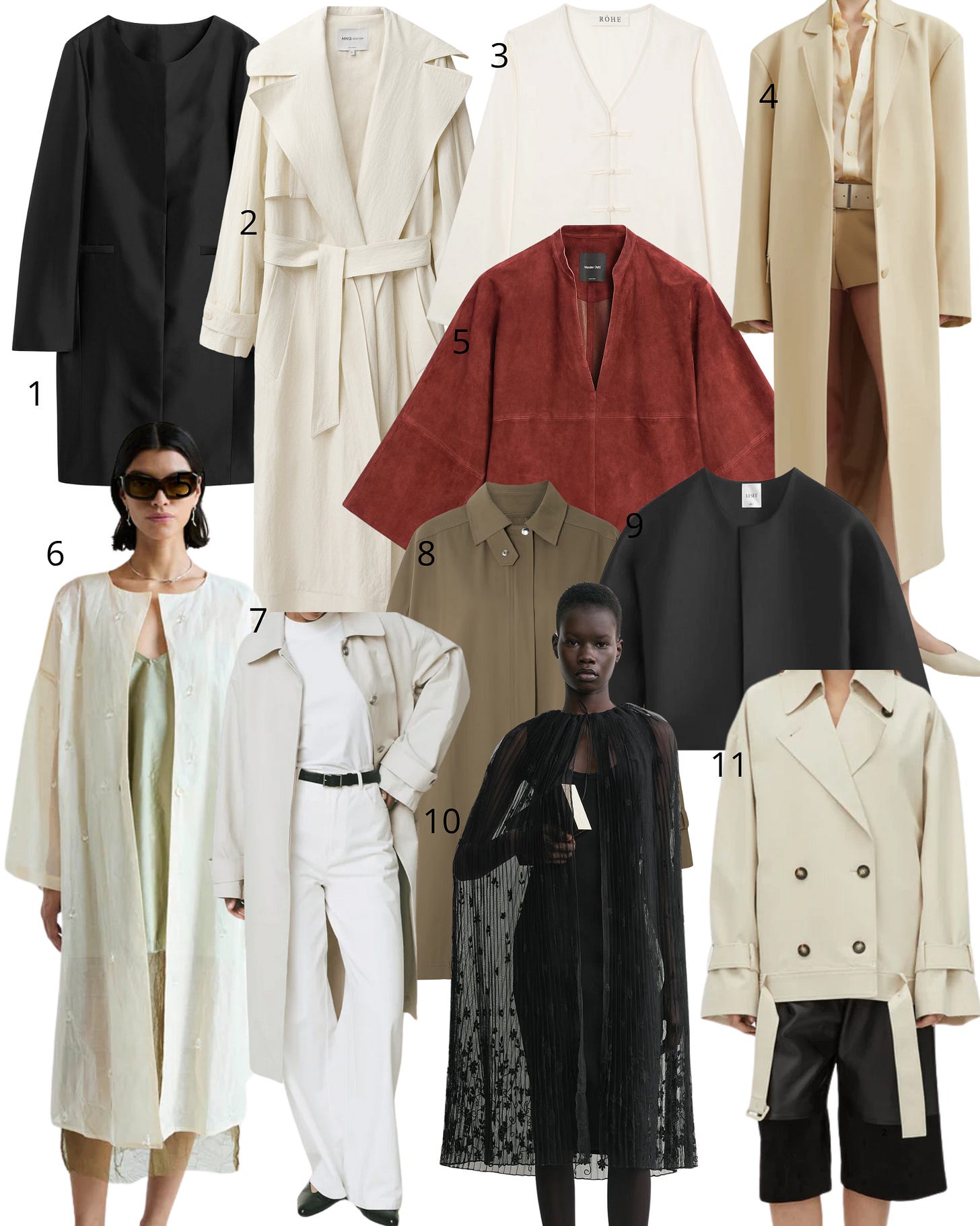 1. Toteme silk coat; 2. Mango ecru trench coat; 3. Rohe Mandarin silk top (can be worn as a light jacket); 4. The Frankie Shop Tribeca coat; 5. Massimo Dutti suede shirt; 6. Chan Luu Paper Trench; 7. Rue Sophie oversized jacket; 8. Toteme cotton trench; 9. Leset Bobbi Jacket; 10. Toteme floral tulle cape; 11. Camilla and Marc short trench.