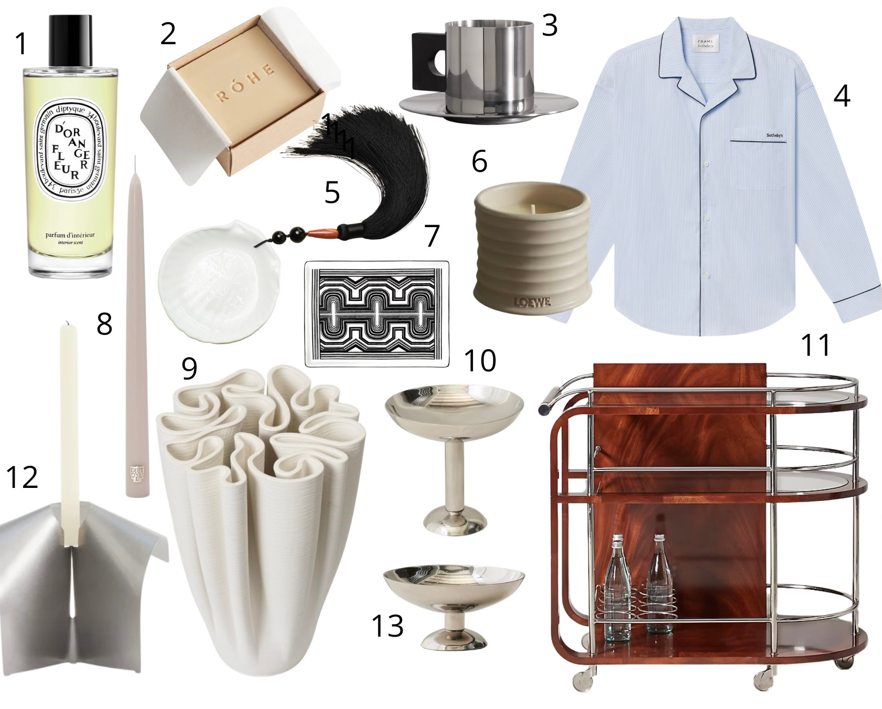 1. Diptyque Orange blossom room spray; 2. Rohe Diplomatico Soap; 3. Louise Roe stainless steel cup; 4. Frame Sotheby's Unisex Pyjama Shirt; 5. Mana x Carina Nicklas shell tassel dish .01; 6. Loewe Oregano candle; 7. Diptyque Basile tray; 8. Diptyque Feu de Bois candle; 9. Ferm living Dedali Vase; 10. Loise Roe Tall metal champagne coupe; 11. Ralph Lauren Duke bar cart; 12. Rohe stainless steel candle holder; 13. Louise Roe low stainless steel champagne coupe glass.