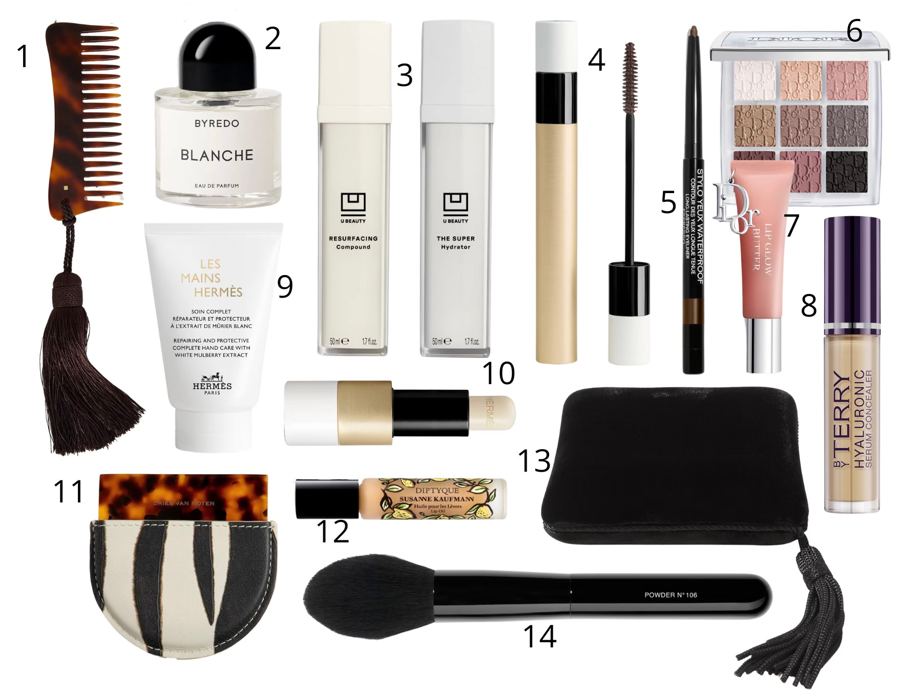 1. Sophie Buhai Tasseled tortoiseshell acetate comb; 2. Byredo Blanche perfume; 3. The U Beauty Duo; 4. Hermes revitalising mascara - 02 Brun Bistre; 5. Chanel Long-Lasting Eyeliner - 20 Espresso; 6. Dior backstage eye palette - 002 Smoky essentials; 7. Dior addict lip glow butter - 103 Toffee; 8. By Terry Hyaluronic serum concealer - 5 Cream beige; 9. Hermes hand cream; 10. Hermes Lip Care Balm; 11. Dries Van Noten mirror; 12. Diptyque x Susanne Kaufmann lip oil; 13. Sophie Bille Brahe Velvet jewellery box; 14. Chanel Powder Brush N°106.