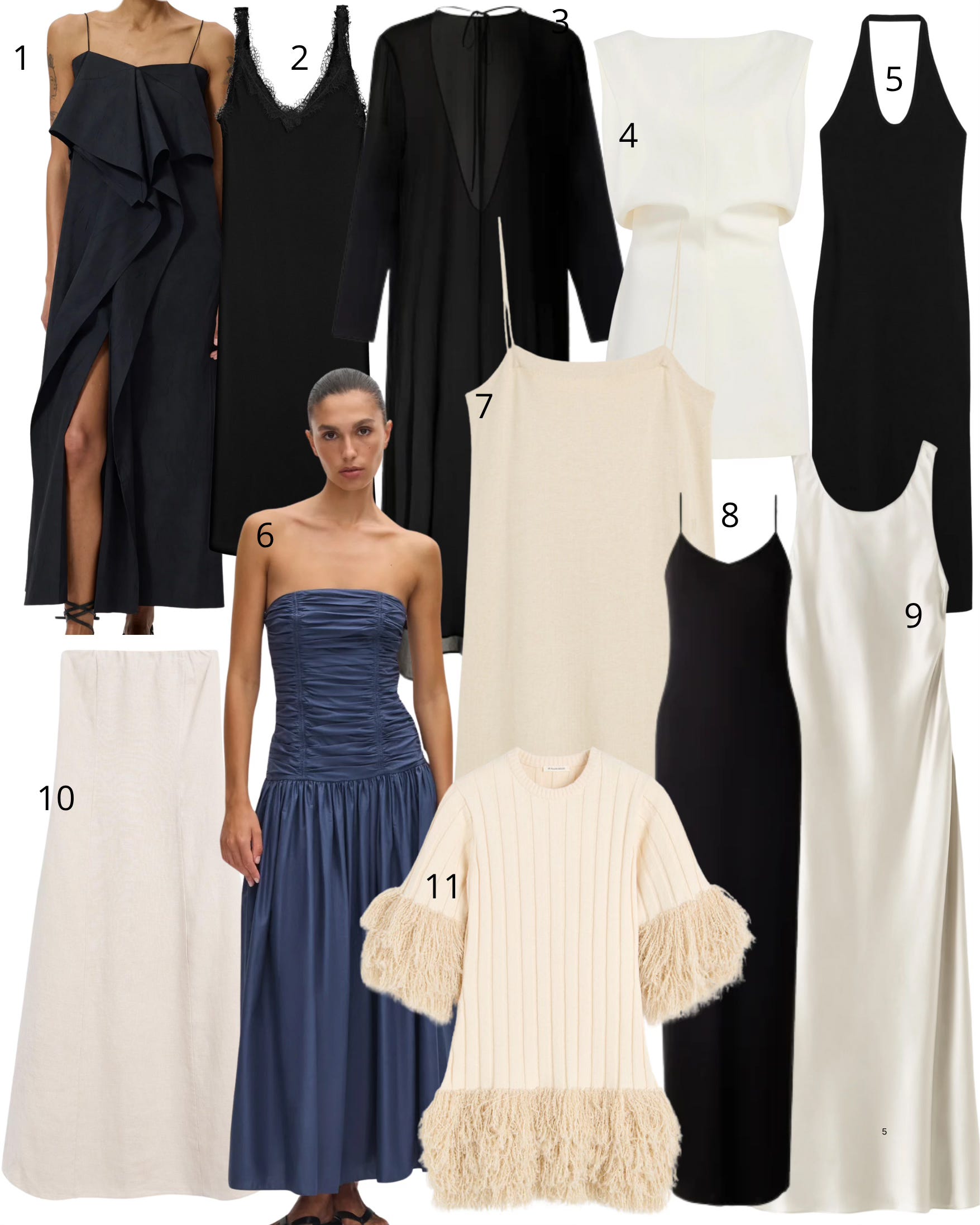 1. Rohe Oranda no Kazaguruma dress; 2. Massimo Dutti dress with lace neckline; 3. Soeur Viktorija dress; 4. Khaite Toma dress; 5. Toteme compact knit halter dress; 6. Matteau drop waist dress; 7. By Malene Birger Edello mini dress; 8. Soeur Naomi dress; 9. Almada label Zila satin dress; 10. Massimo Dutti long strapless dress; 11. By Malene Birger Lina mini dress.