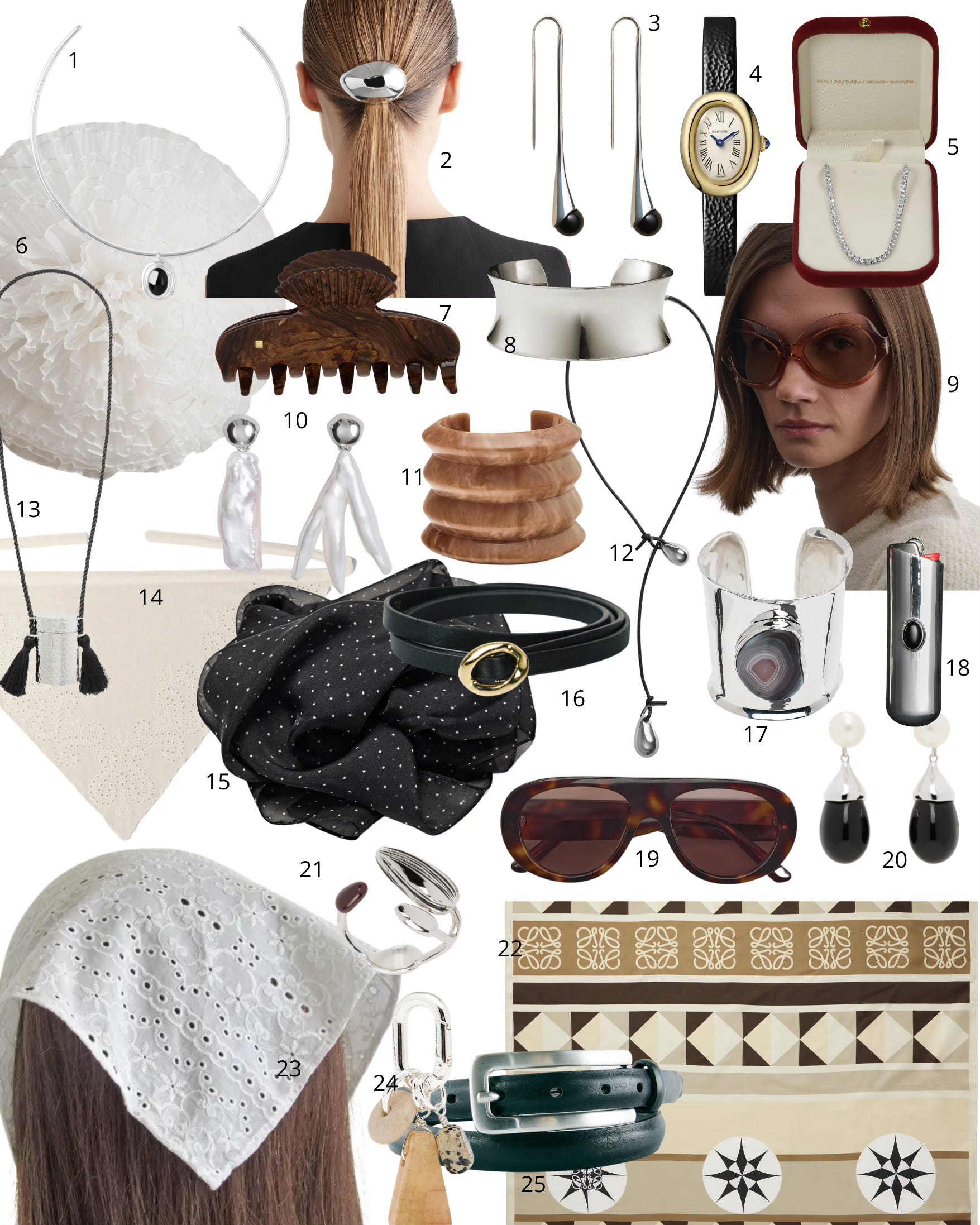 1. Lie Studio The Cleo Necklace; 2. Cos hair band; 3. Sophie Buhai Silver Vienna Earrings; 4. Cartier Baignoire Mini; 5. Heaven Mayhem Tennis necklace; 6. Phoebe Philo big bloom brooch; 7. Sophie Buhai Small Fan Shell Claw Hair Clip; 8. Agmes Georgia cuff; 9. Phoebe Philo Bliss sunglasses in raspberry acetate; 10. Phoebe Philo pearl earrings; 11. Massimo Dutti bracelet; 12. Phoebe Philo Pebble duo pendant; 13. Sophie Buhai Boîte silver and tasseled cord necklace; 14. Maje triangle cotton scarf; 15. Massimo Dutti silk scarf; 16. Dehanche Orbite belt; 17. Sophie Buhai Barbara bracelet; 18. Sophie Buhai eclipse lighter case; 19. Massimo Dutti sunglasses; 20. Sophie Buhai Audrey earrings; 21. Lemaire Girasol ring; 22. Loewe silk scarf; 23. Etsy scarf; 24. Massimo Dutti stone charm; 25. Tibi Darwin belt.