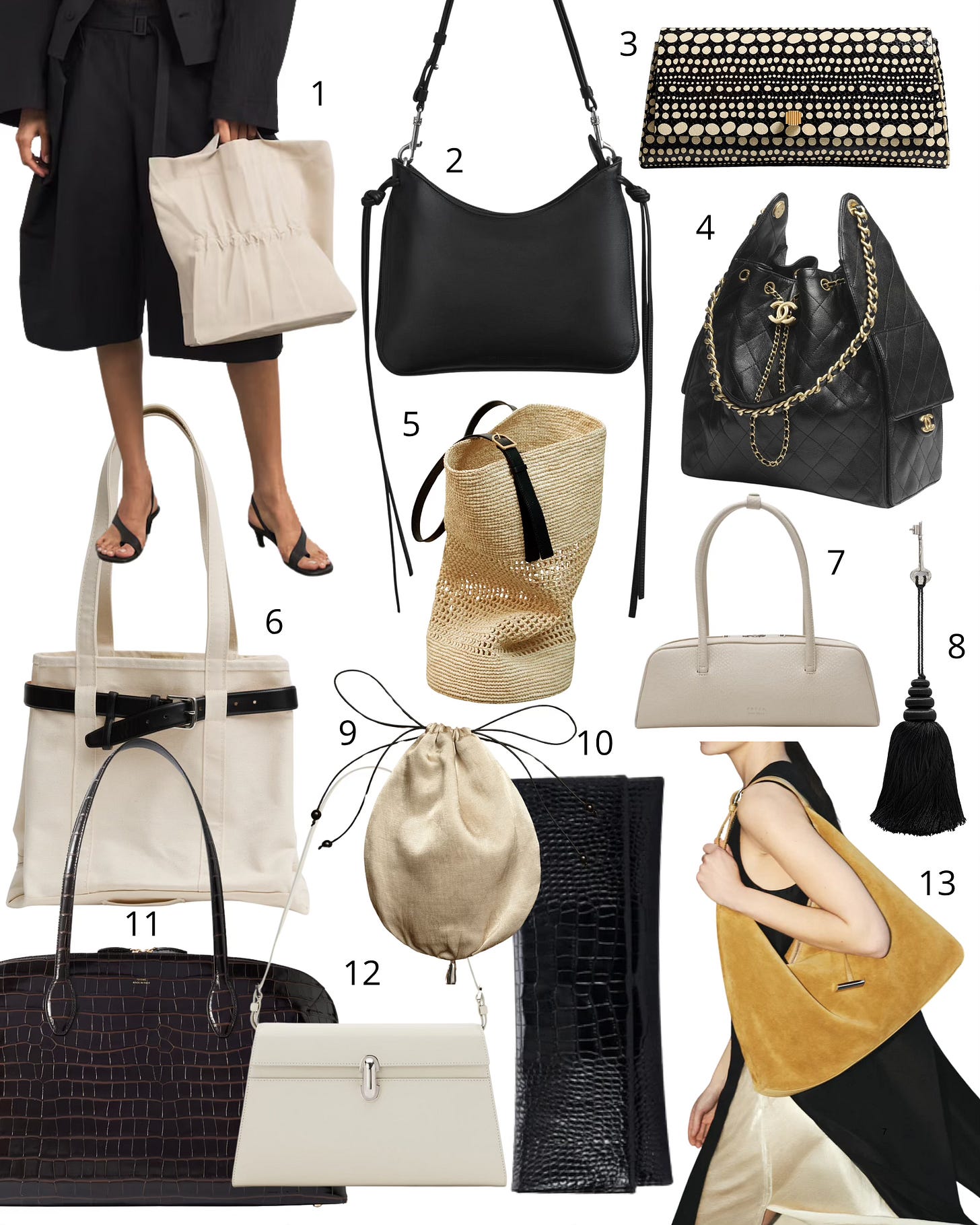 1. Issey Miyake Small Drawn and Pressed Tote Bag; 2. Phoebe Philo Small Gig bag; 3. Khaite Audrie clutch; 4. Chanel 25 bag; 5. Khaite Billie bucket bag; 6. Tibi The re-imagined boat and tote; 7. Freja Mercer bag; 8. Sophie Buhai bag charm; 9. Sophie Buhai teardrop pouch; 10. Soeur Pirrie pouch; 11. Toteme Day tote; 12. Savete Symmetry shoulder bag; 13. Liffner pillow hobo bag.