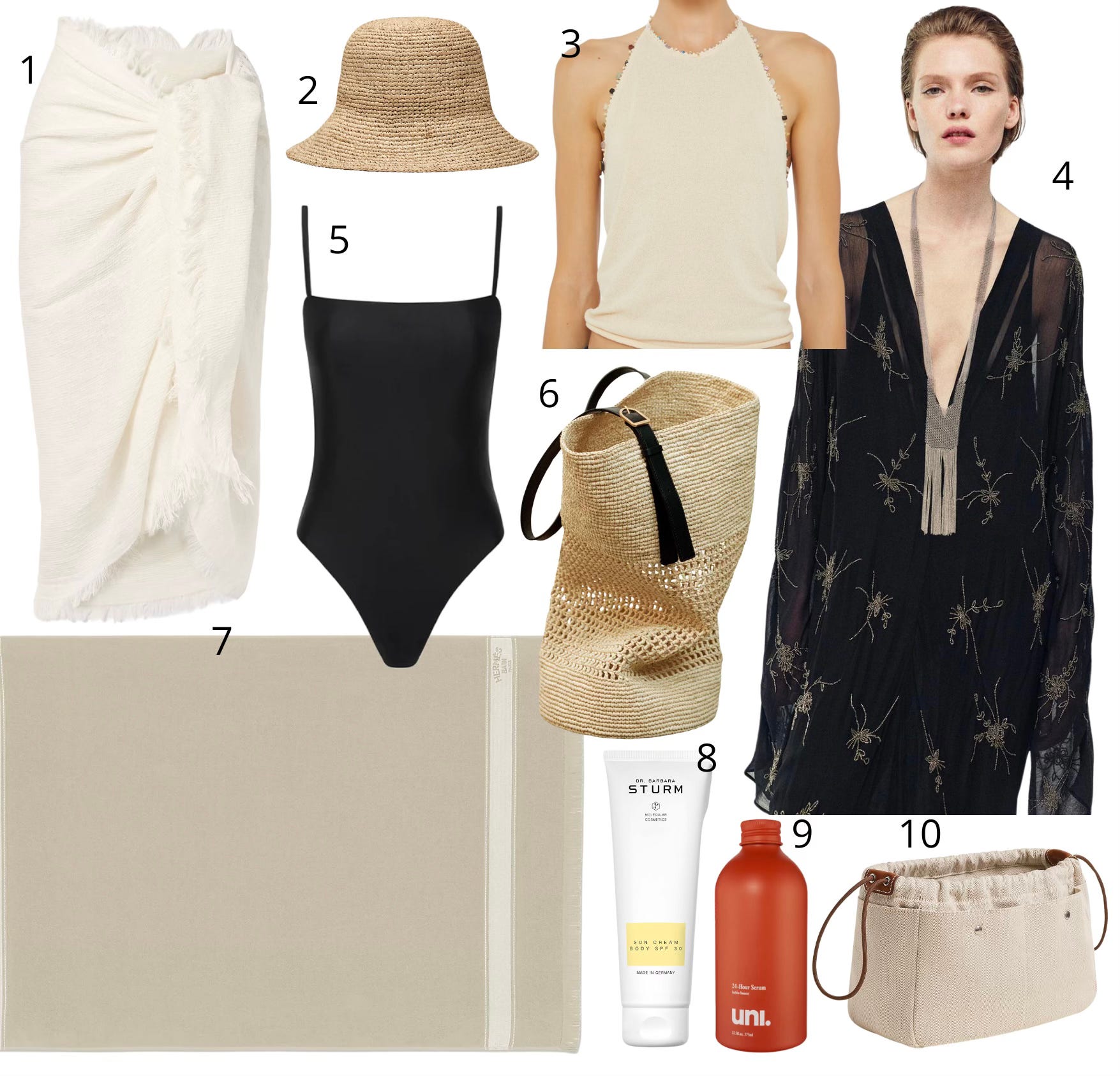 1. Toteme Fringed linen-blend bouclé-jacquard scarf; 2. Massimo Dutti raffia hat; 3. Christopher Esber beach quartz halter tank; 4. Massimo Dutti flowing midi dress with embroidery; 5. Matteau petite square maillot; 6. Khaite Billie bucket bag; 7. Hermes yachting beach towel; 8. Dr. Barbara Sturm body sun cream spf30; 9. Uni refillable body serum; 10. Hermes Fourbi 25 pouch;