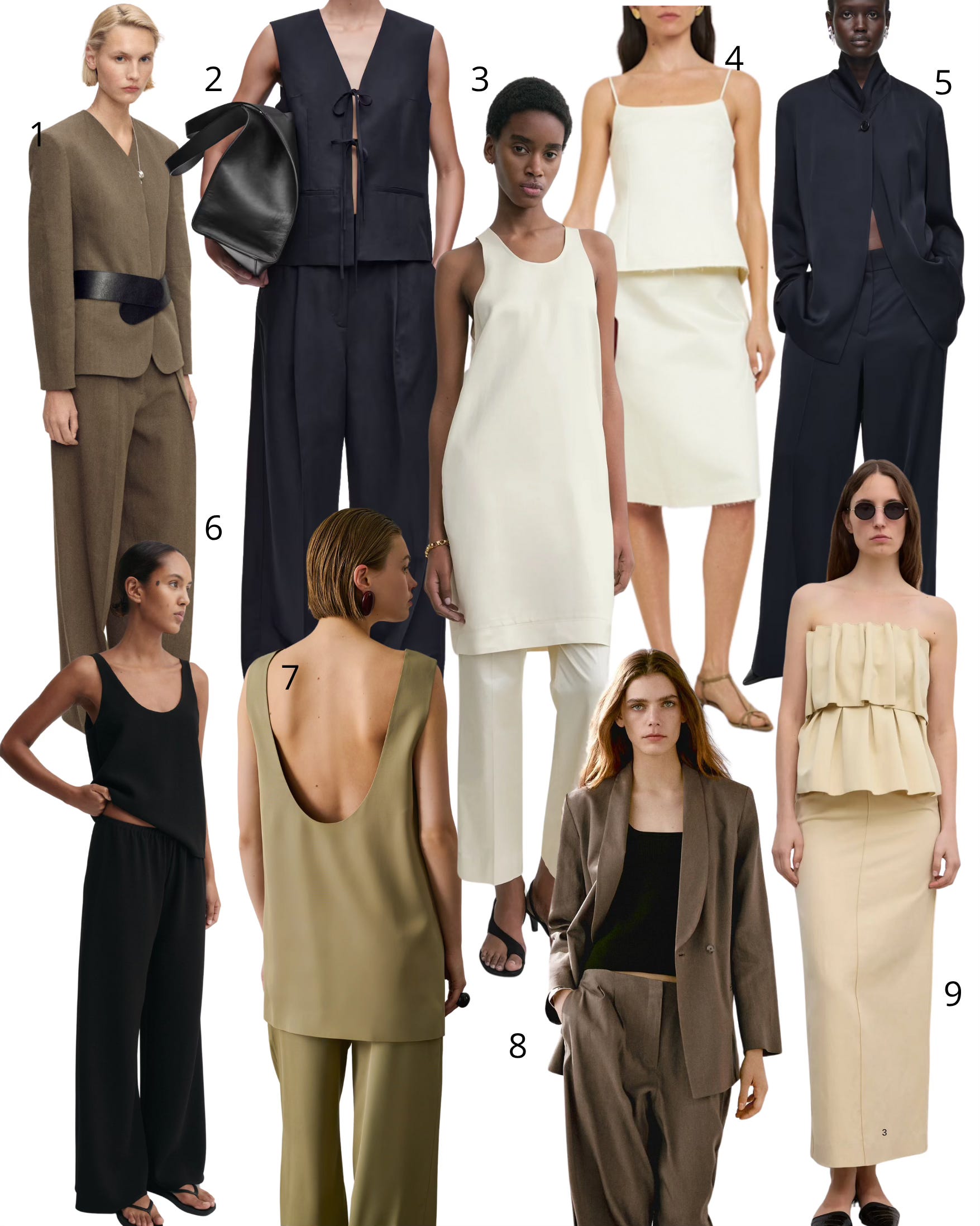 Mango suit jacket and trousers; 2. Cos linen-blend trousers and tie-front waistcoat; 3. Toteme scoop-neck dress and cropped trousers; 4. The Garment Kelly top and Kelly skirt; 5. Cos satin tuxedo jacket and wide-leg trousers; 6. Almada Label Romy crepe top and Bea crepe pants; 7. Soeur Maya dress and Jessie Trousers (or Caroline skirt); 8. Massimo Dutti linen blend straight leg trousers and dinner jacket; 9. House of Dagmar sculpted tube top and long pencil skirt.