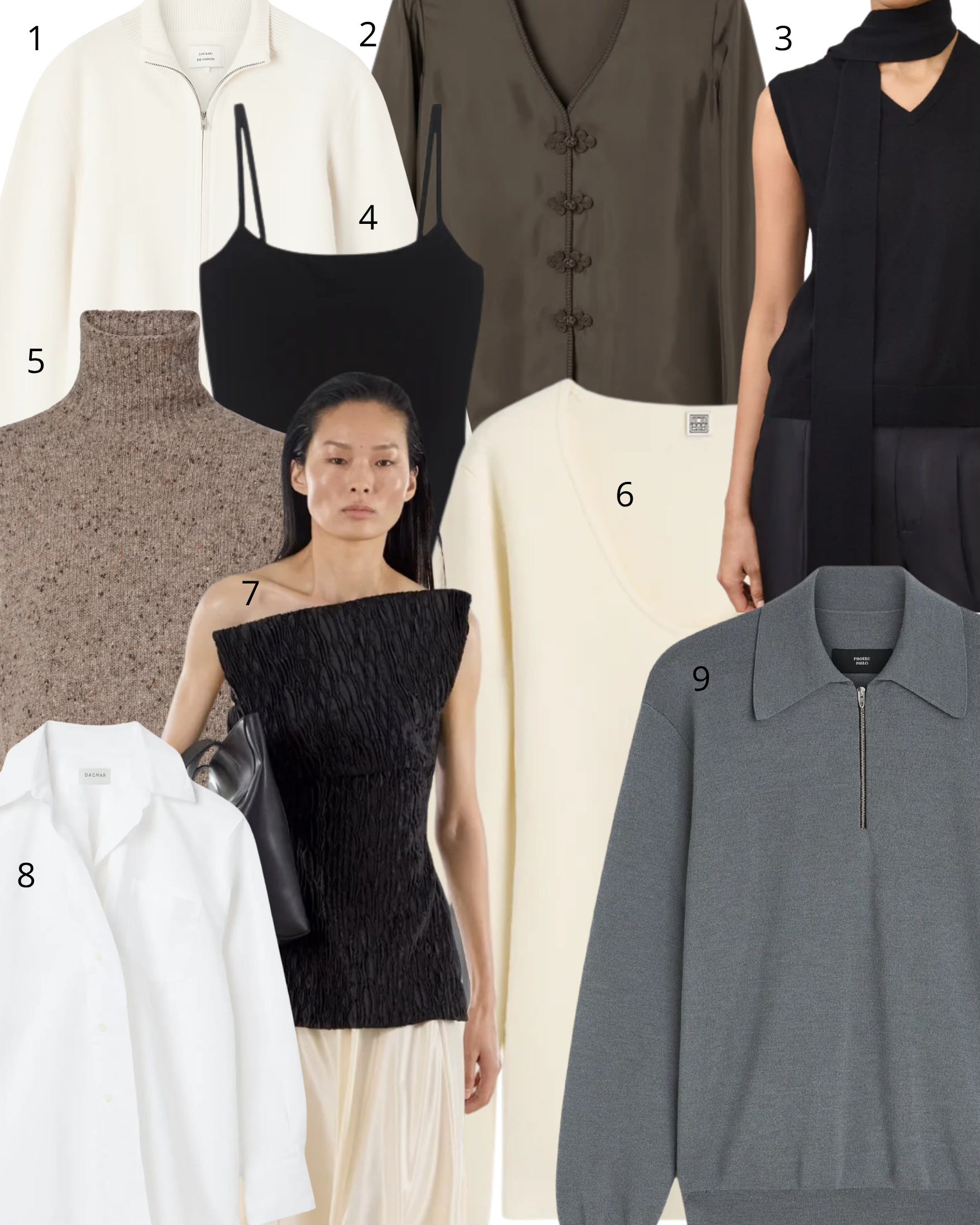 1. Loulou de Saison cashmere zip cardigan; 2. Rohe silk top; 3. Lisa Yang scarf top; 4. The Slow Label tank top; 5. The Row turtleneck top; 6. Toteme knit top; 7. Camilla and Marc top; 8. House of Dagmar linen shirt; 9. Phoebe Philo zip polo.