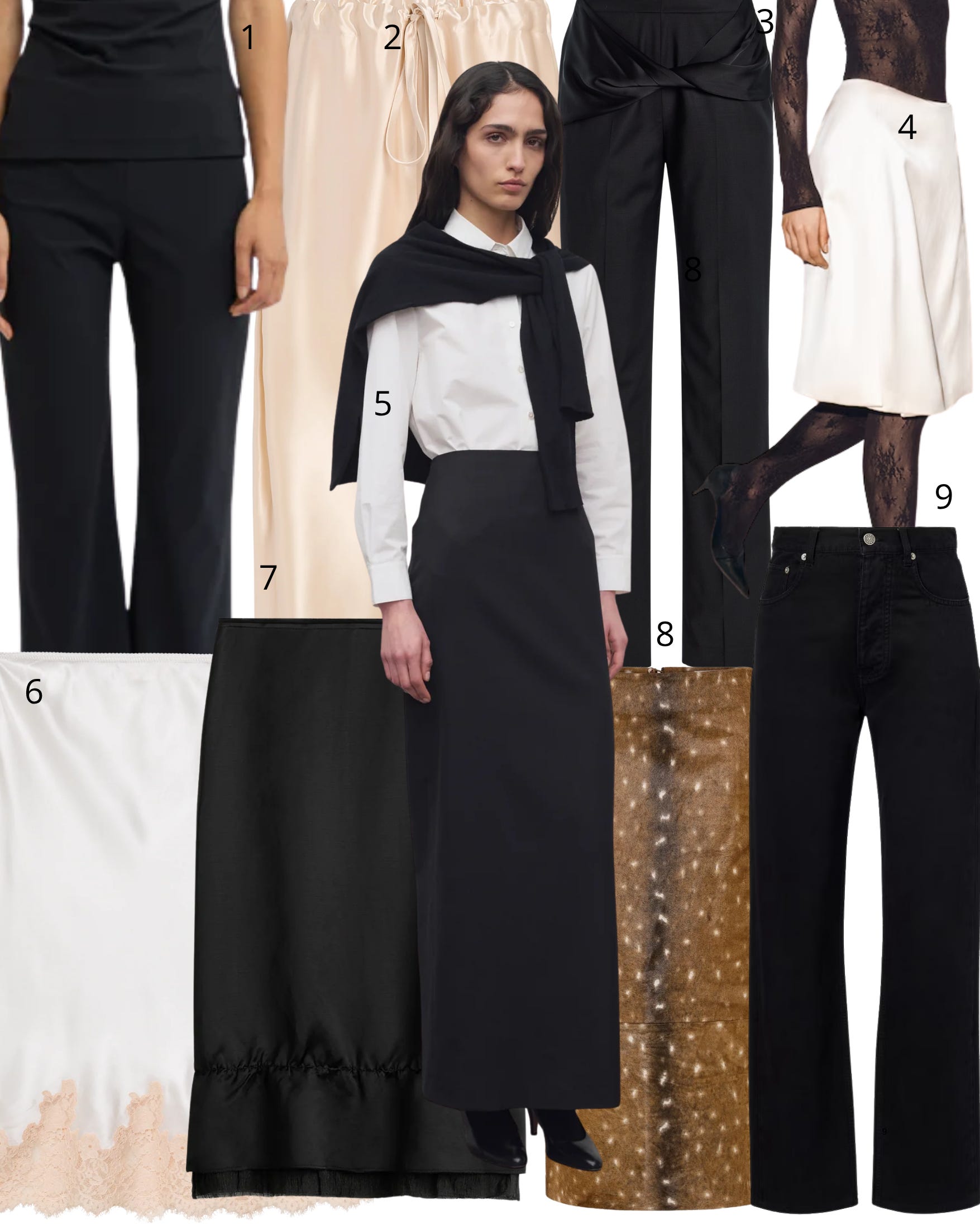 1. Reyem pant; 2. Khaite Rohen pant; 3. Tove wool trouser; 4. COS Satin wrap skirt; 5. The Row maxi skirt; 6. Doen satin skirt; 7. Toteme midi skirt; 8. St. Agni pencil skirt; 9 Phoebe Philo Classic jeans.