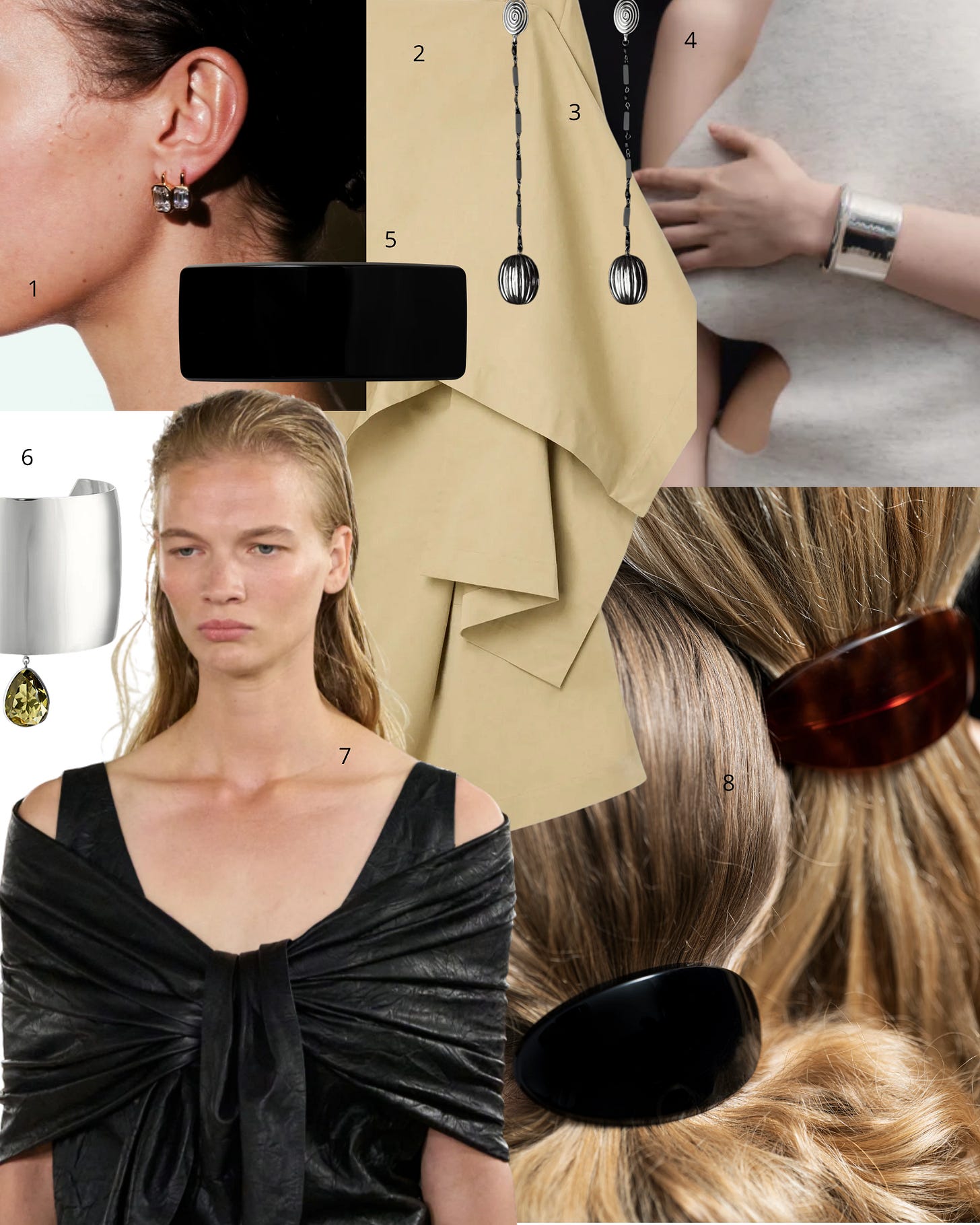1. Dorsey earrings; 2. House of Dagmar trench cape; 3. Juju Vera Stella earrings; 4. Agmes cuff; 5. Sophie Buhai hair clip; 6. Juju Vera cuff; 7. Toteme big scarf; 8. Sophie Buhai hair clips.