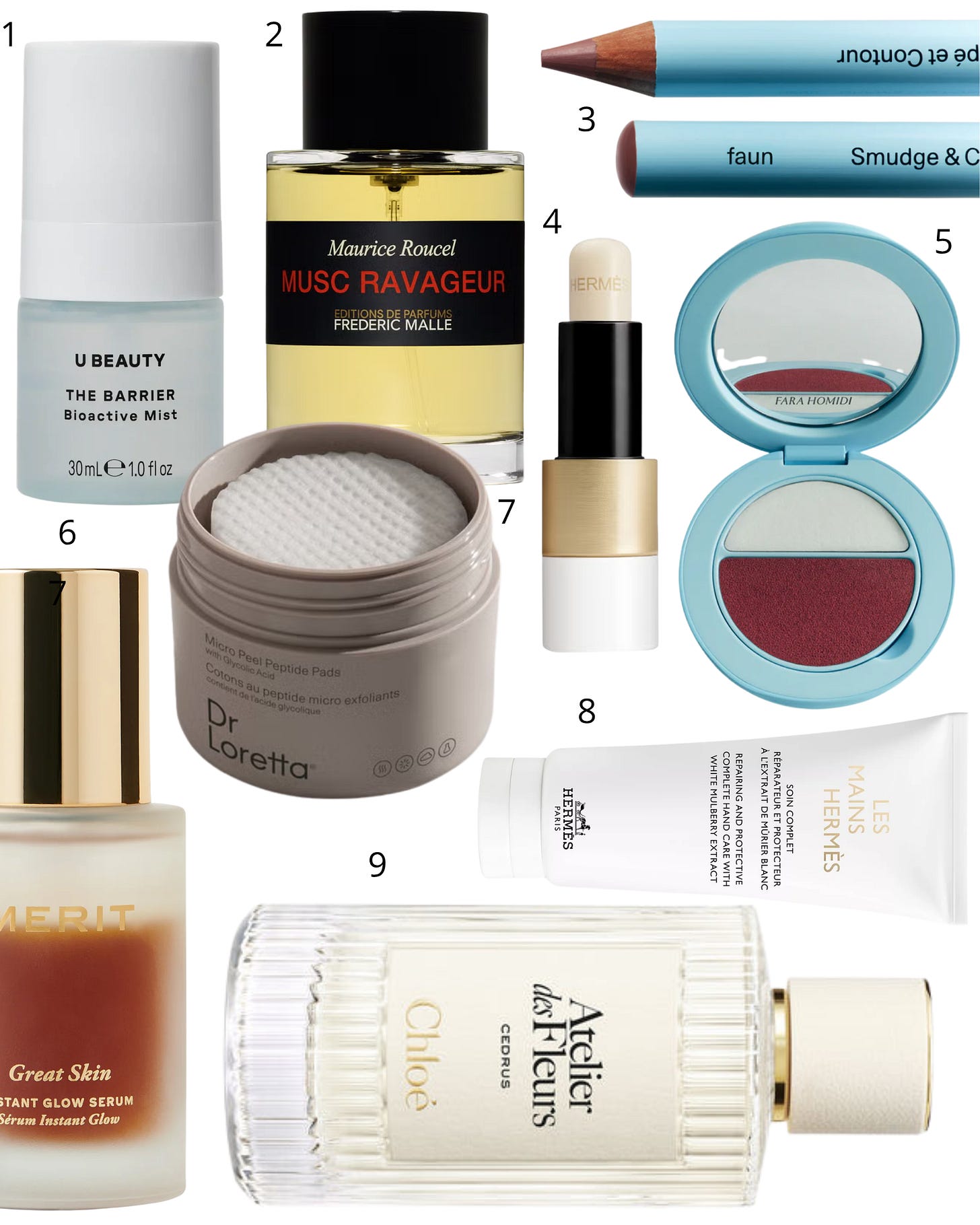 1. U Beauty hydrating mist; 2. Frederic Malle Musc Ravageur perfume; 3. Fara Homidi lip pencil; 4. Hermes lip balm; 5. Fara Homidi lip compact; 6. Merit glow serum; 7. Dr Loretta micro peel peptide pads; 8. Hermes hand creme; 9. Chloe Atelier des Fleurs Cedrus.