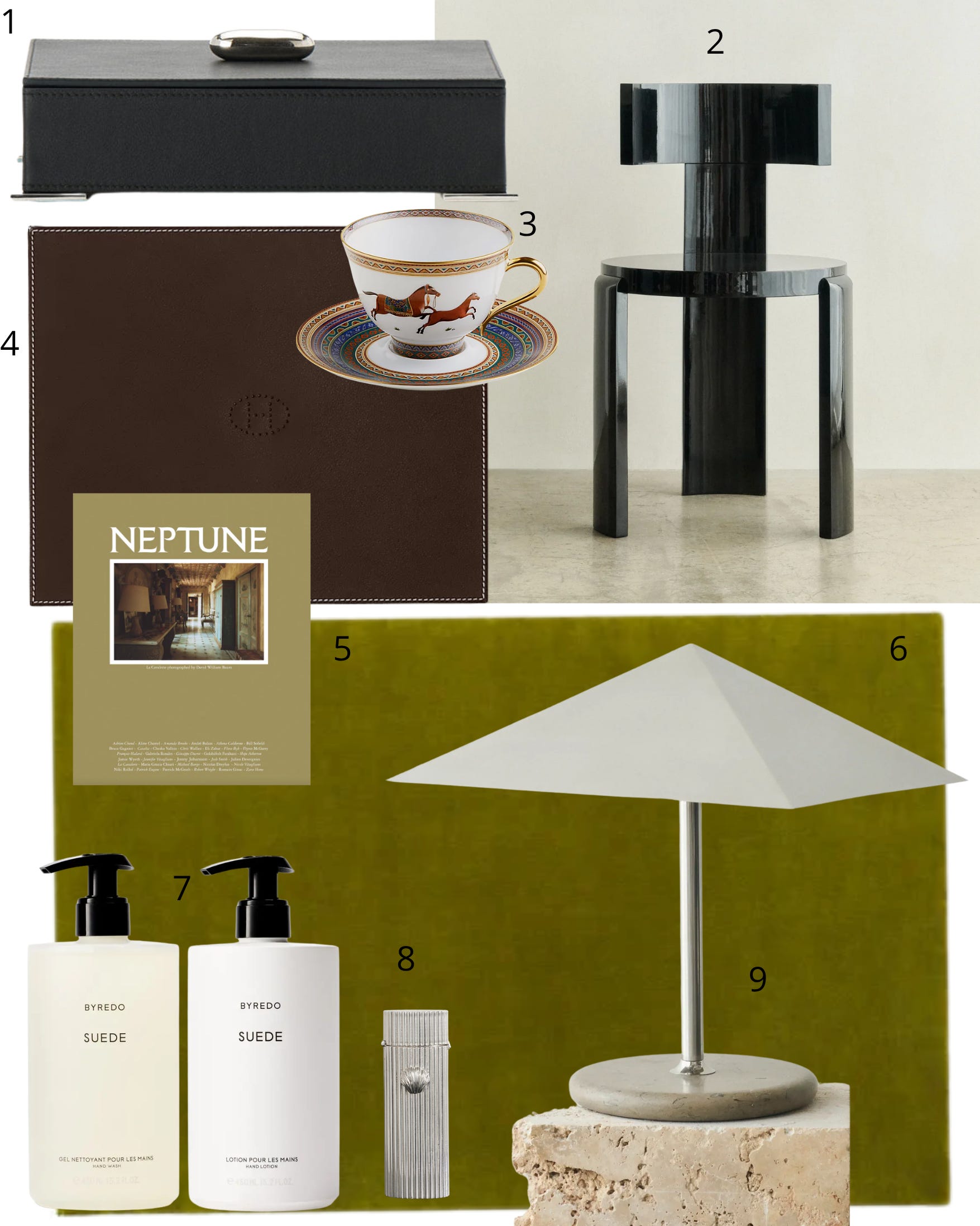 1. Savette small box; 2. Louise Roe chair; 3. Hermes tea cup; 4. Hermes mouse pad; 5. Neptune magazine; 6. Nordic Knots rug in Milano green; 7. Byredo hand wash and creme; 8. Juju Vera silver lighter holder; 9. Louise Roe Loft lamp.