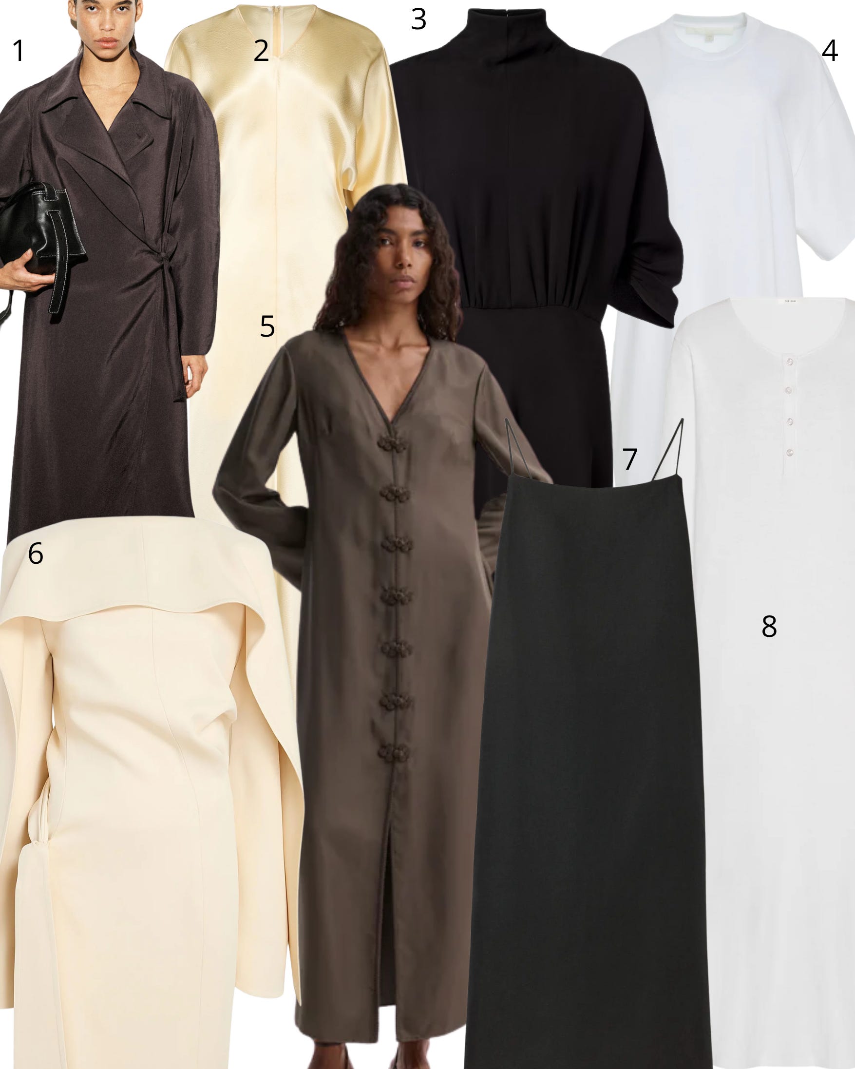 1. COS midi dress; 2. Fforme maxi dress; 3. The Row midi dress; 4. Ruadh t-shirt dress; 5. Rohe silk dress; 6. Khaite maxi dress; 7. House of Dagmar open back dress; 8. The Row cotton maxi dress.