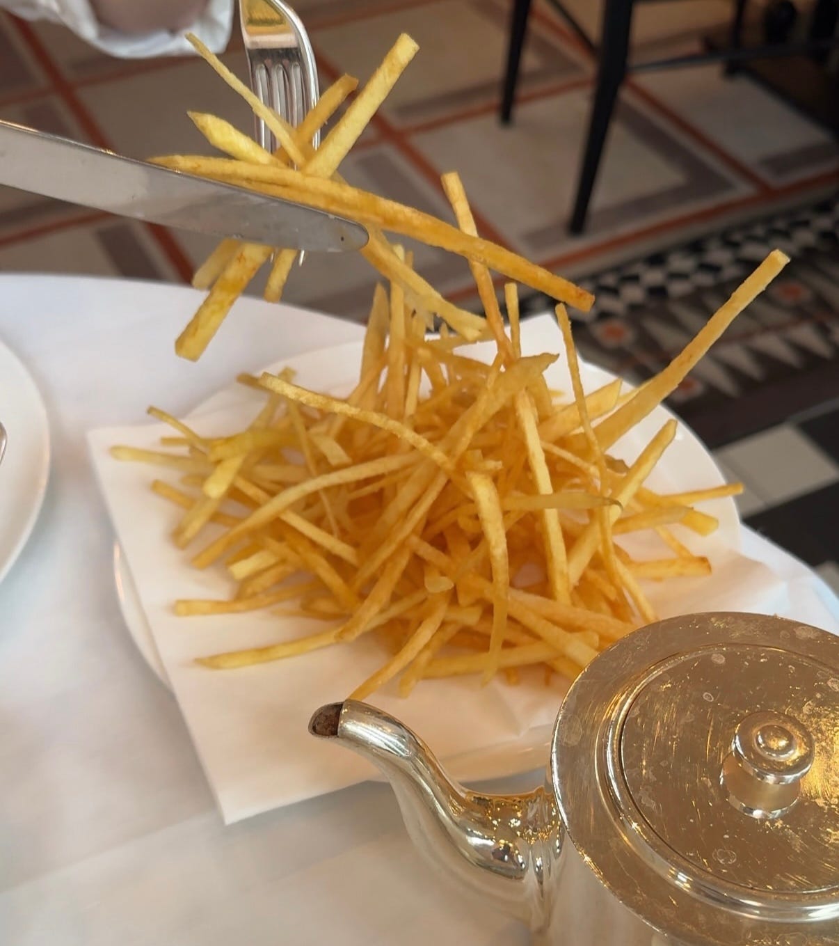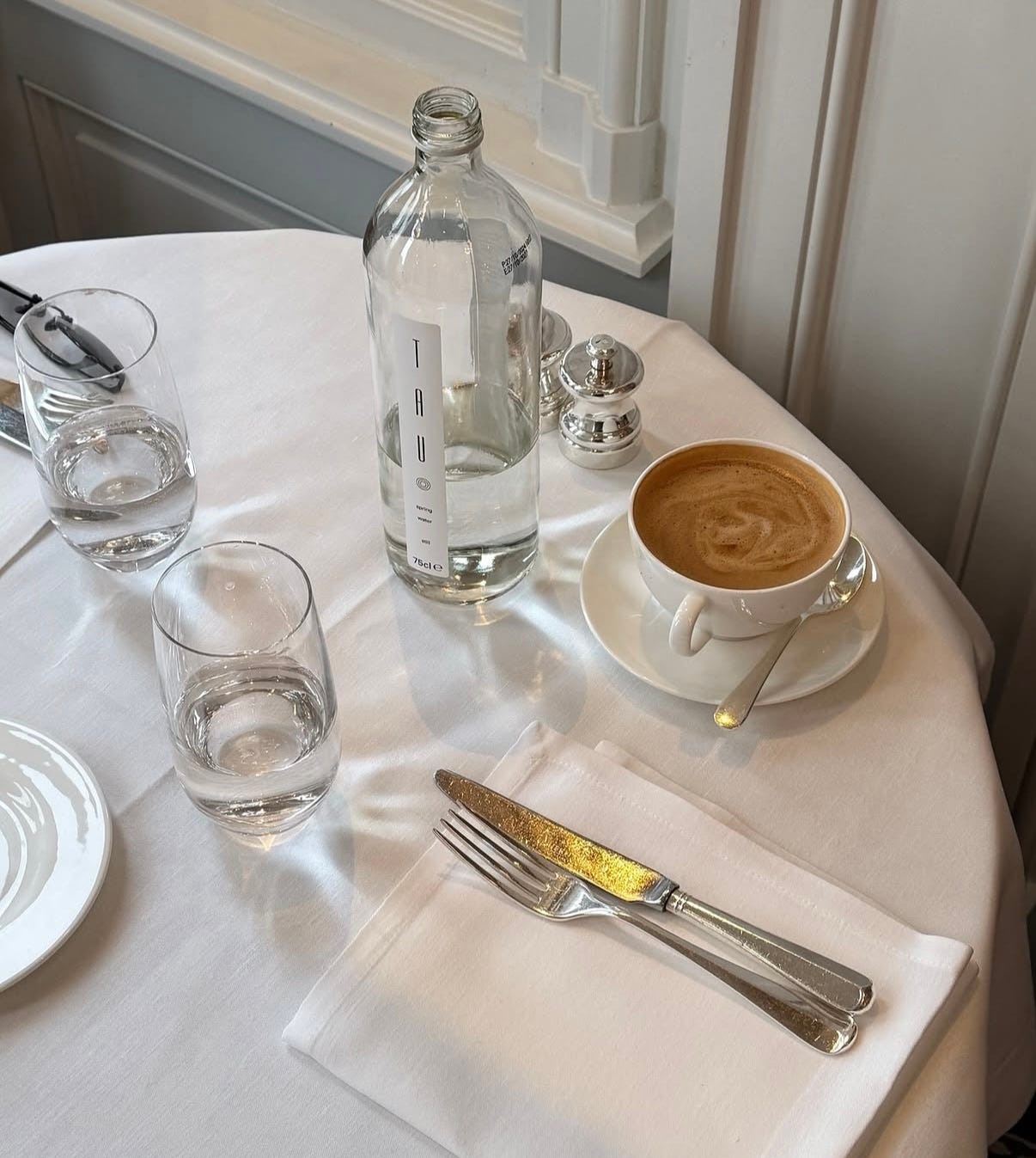 At least I bought one thing after browsing Sloane Square — lunch at At Sloane. Couldn’t find the entrance, it’s a private 5 star house, which becomes obvious once you’re inside. The dining room sits on the sixth floor, small, not too many tables. Quiet in the best way. British style meets François-Joseph Graf — elegant, considered, the kind of space that makes you want to linger.