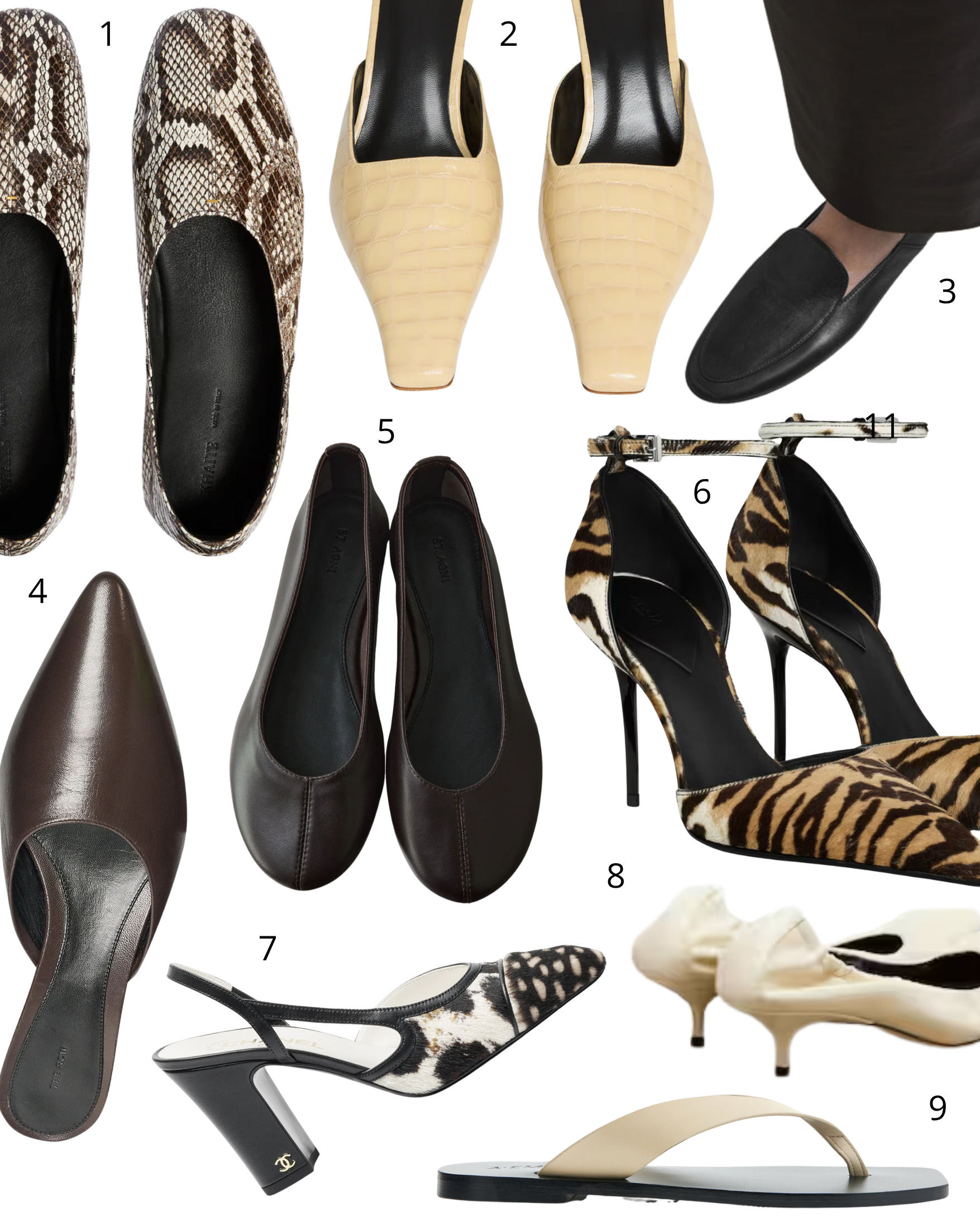 1. Khaite python flats; 2. Jude croc mules; 3. Dear Frances Gio loafer; 4. The Row mules; 5 St. Agni ballet flats; 6. Alaia pumps; 7. Very sought after Chanel higher slingbacks, couldn’t locate them anywhere. But last time I’ve heard, Sourcewhere might be able to help; 8. Phoebe Philo low pump; 9. A. Emery sandal.