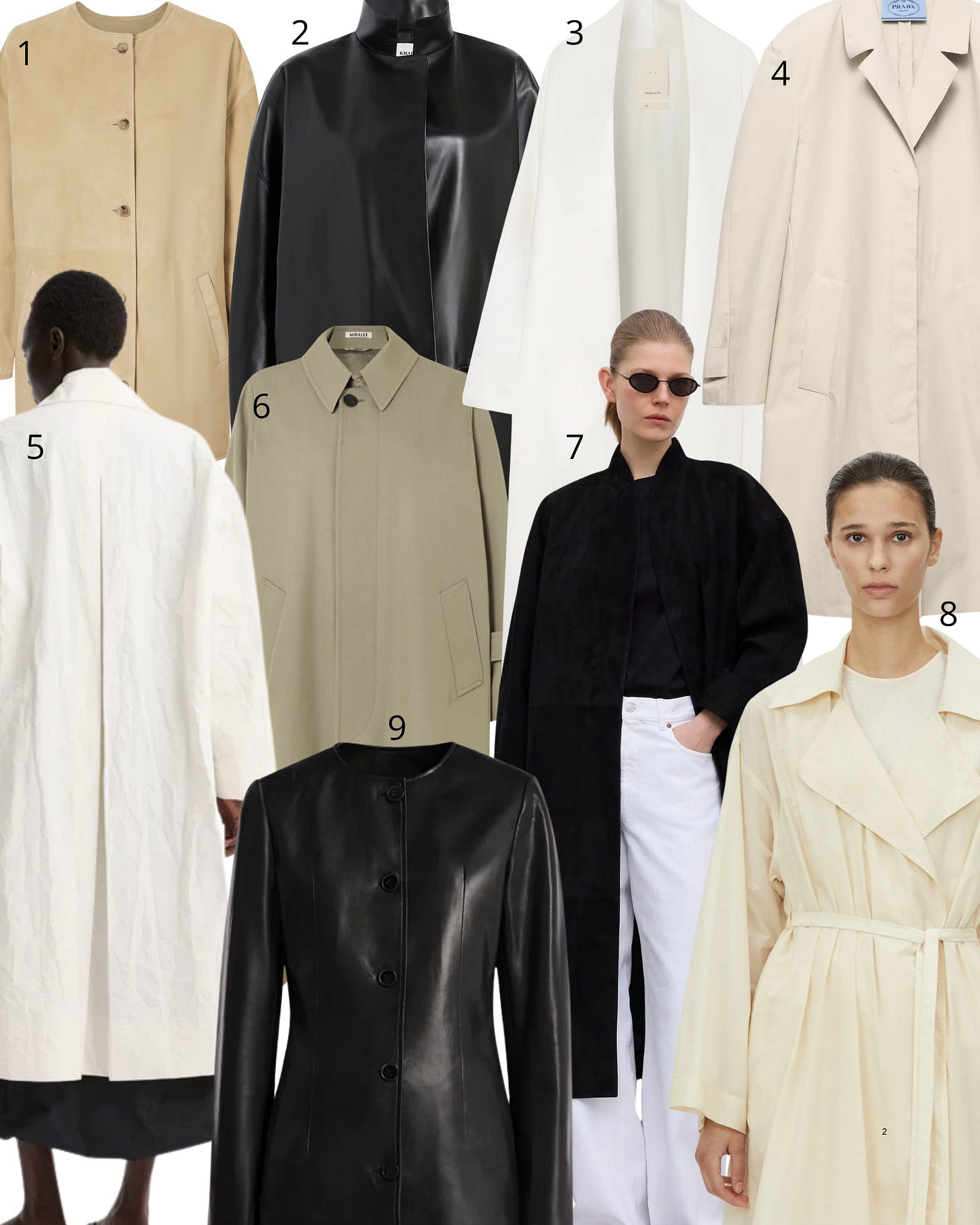 1. Loulou de Saison jacket; 2. Khaite leather jacket; 3. Colleen Allen coat; 4. Prada poplin coat; 5. Rohe cotton coat; 6. Auralee trench coat; 7. House of Dagmar suede coat; 8. Camilla and Marc sheer trench coat; 9. Nour Hammour leather jacket.