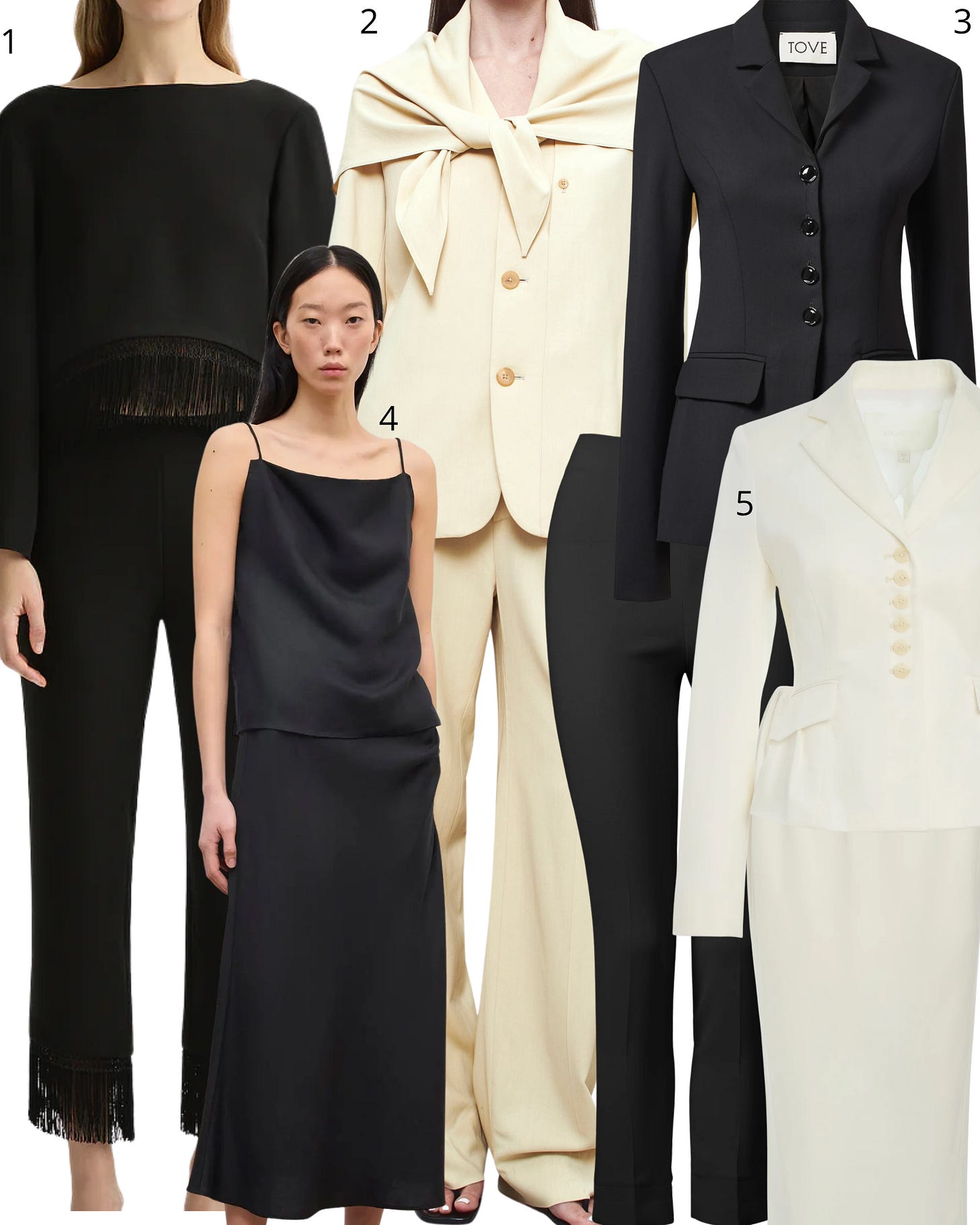 1. Posse blouse and pant; 2. Kallmeyer scarf blazer and trousers; 3. Tove fitted blazer and cropped trouser; 4. House of Dagmar linen skirt and top; 5. Ruadh jacket and skirt.