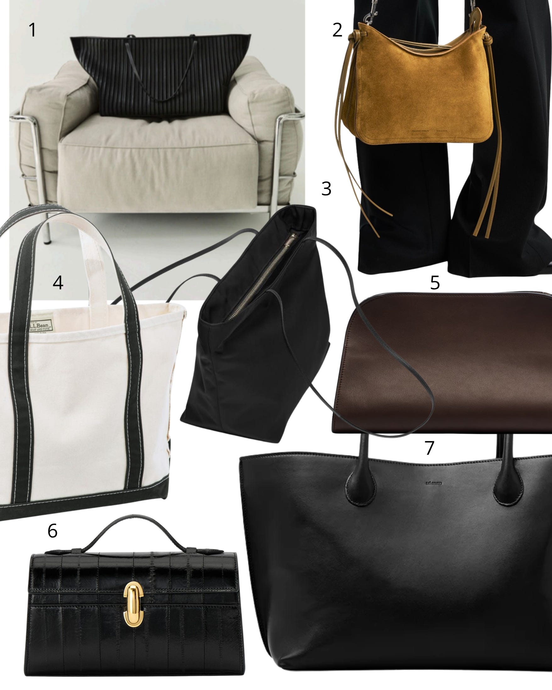 1. St. Agni tote; 2. Phoebe Philo small Gig bag; 3. Valesque nylon tote; 4. L.L. Bean tote; 5. The Row Peggy; 6. Savette eel symmetry; 7. Lie Studio tote.